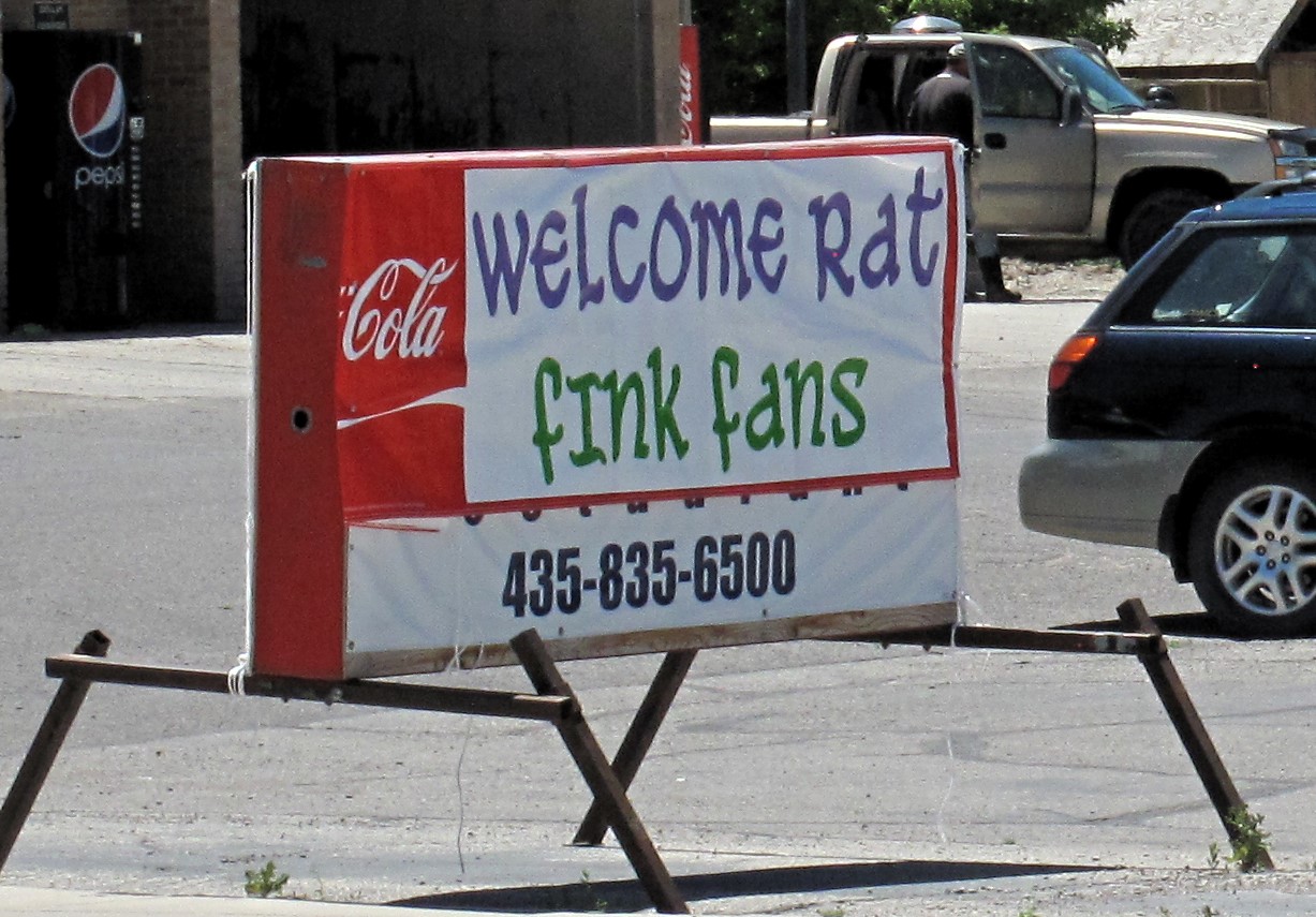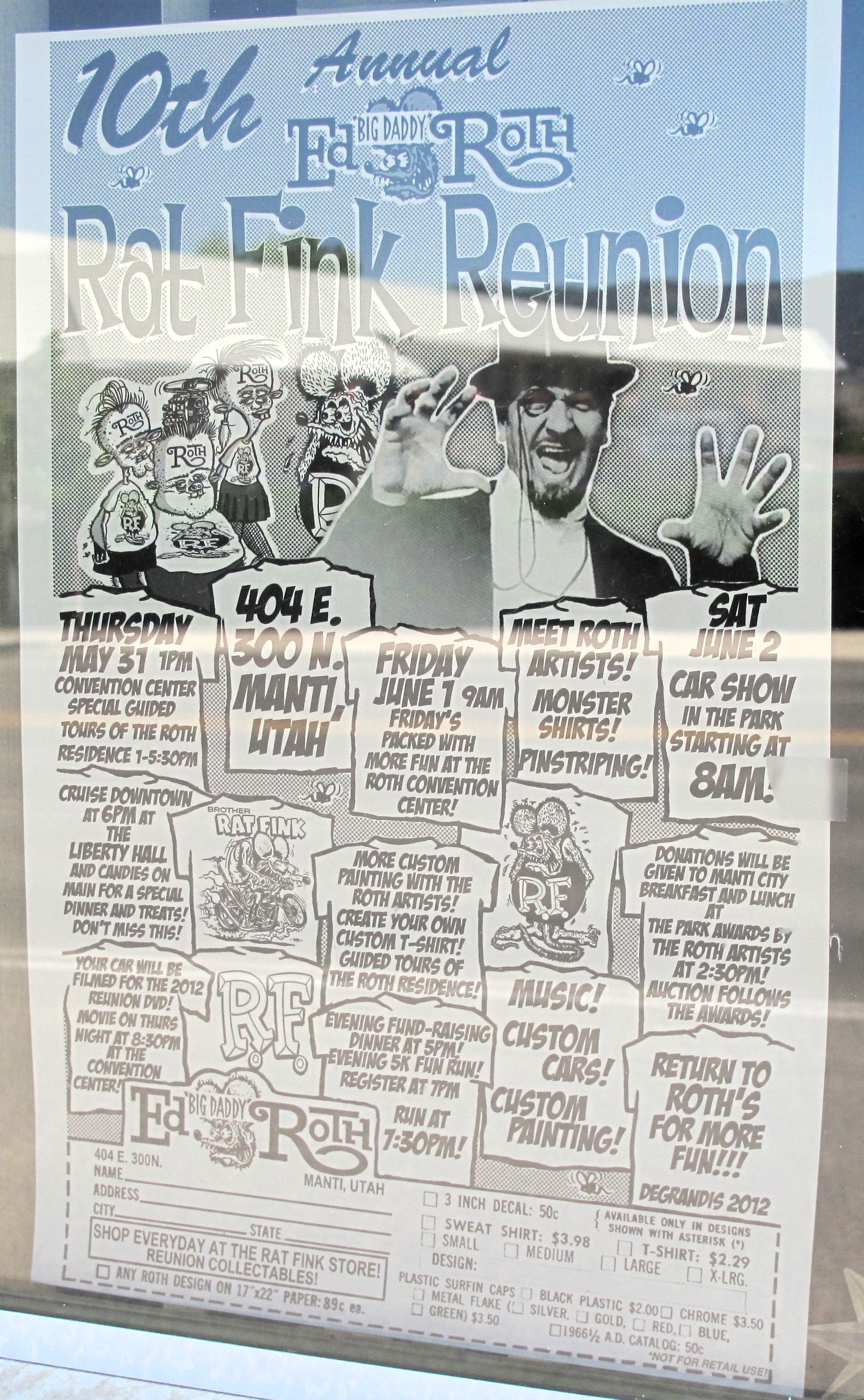 I was shocked to see this poster on a local shop window along Main Street. References to something called “Rat Fink” seemed greatly out of place in this quiet, staid Mormon town.
