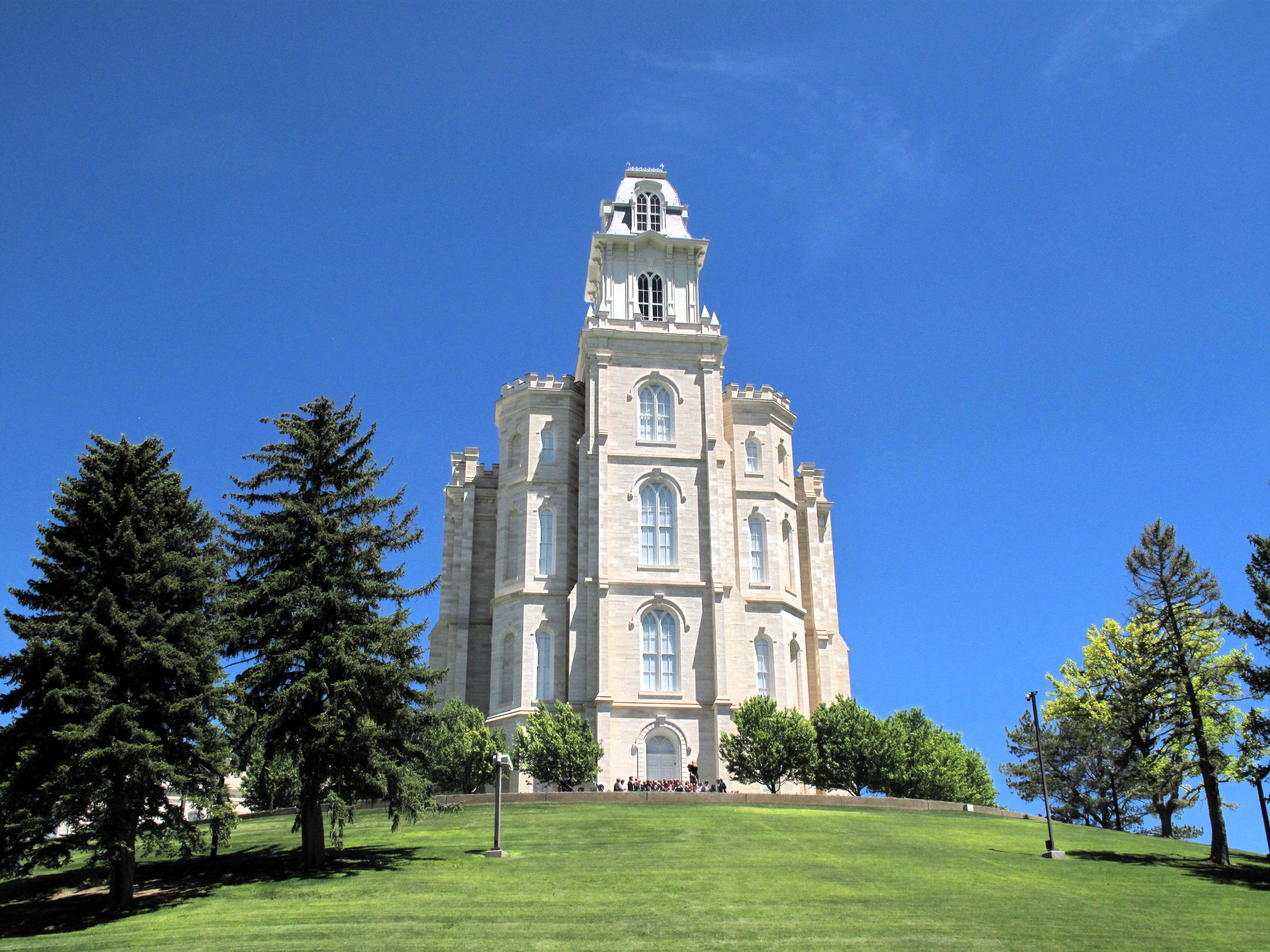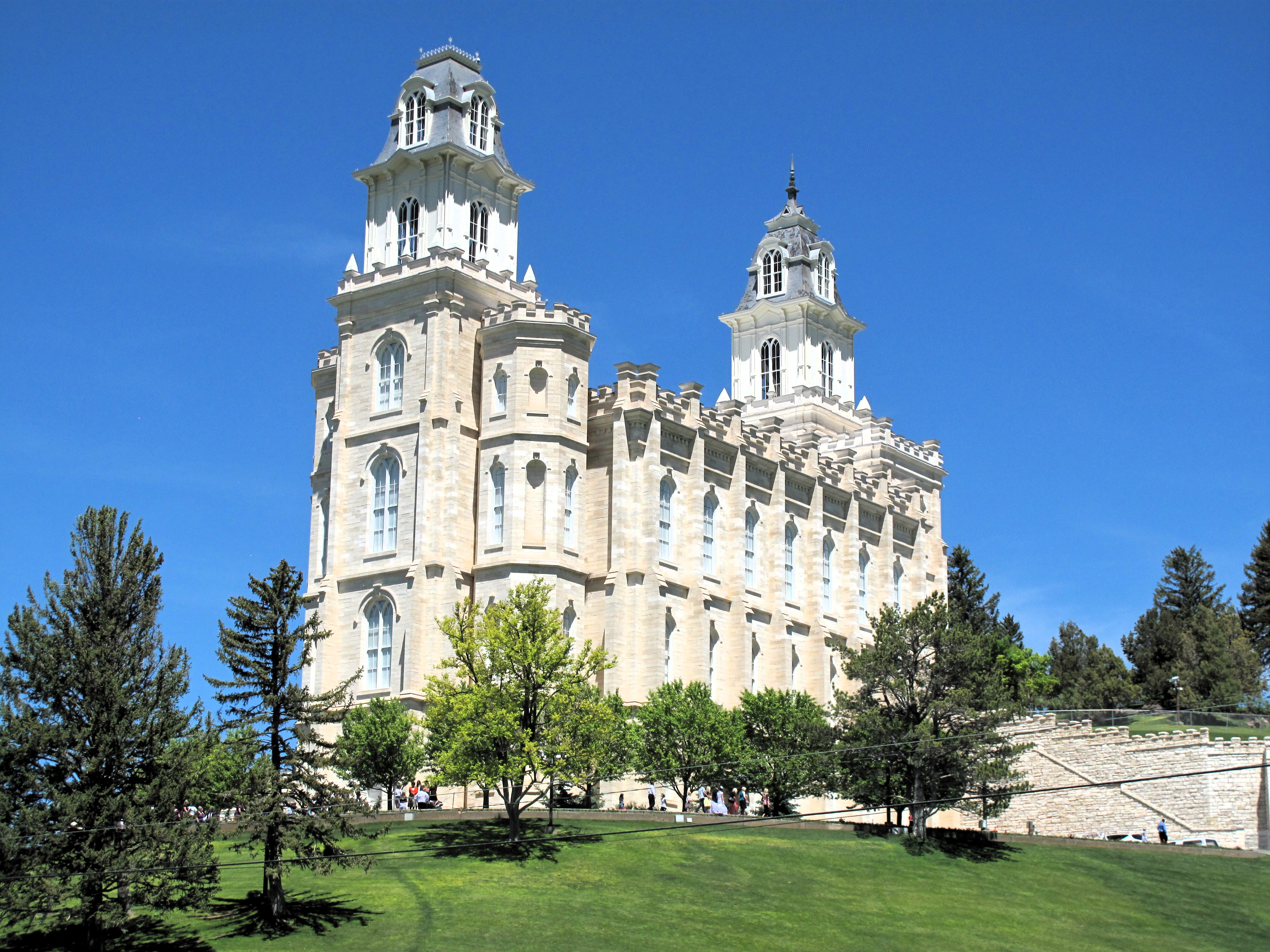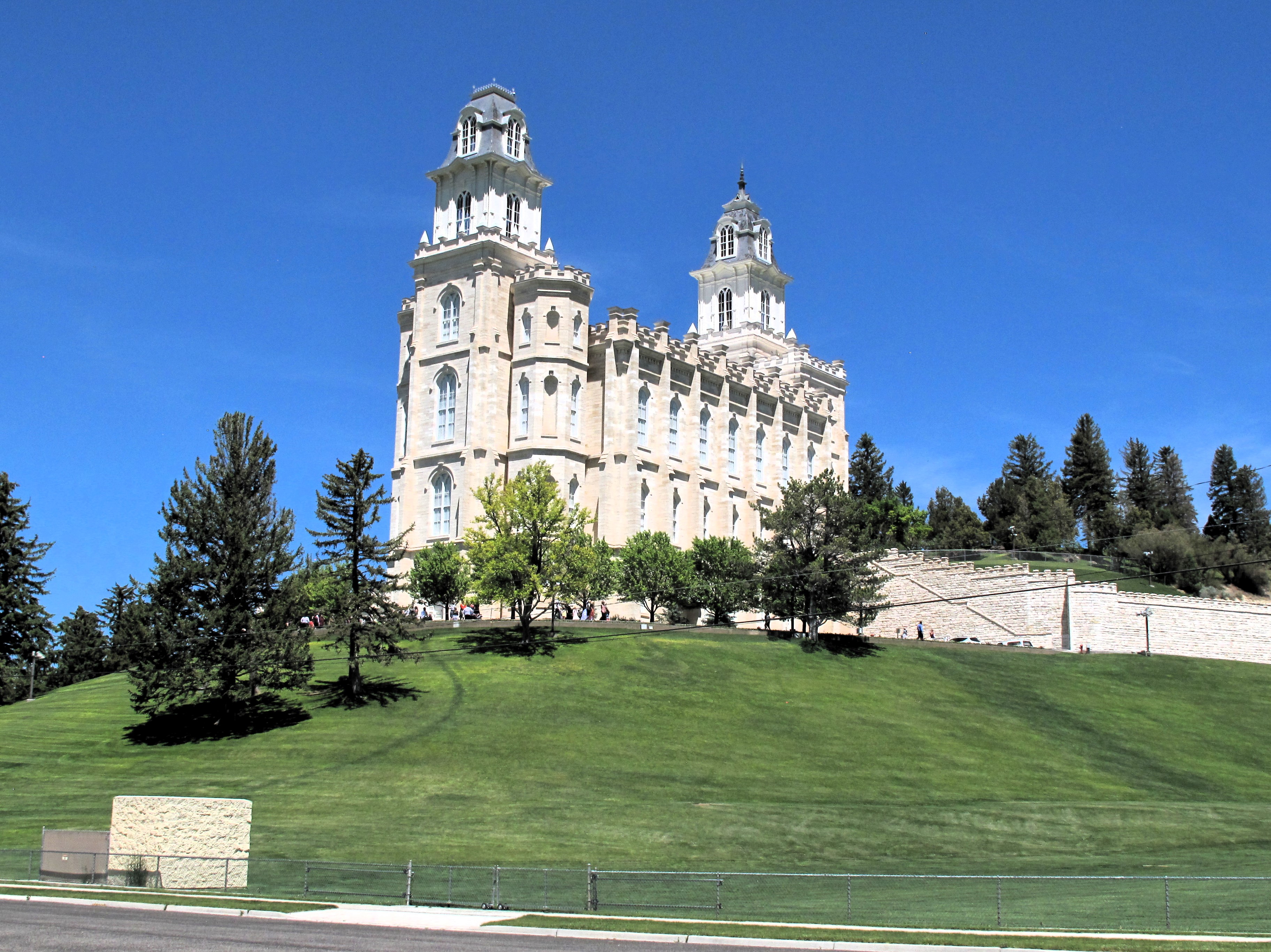 The modern four-story hilltop Mormon Manti Utah Temple is the largest building in town by far.