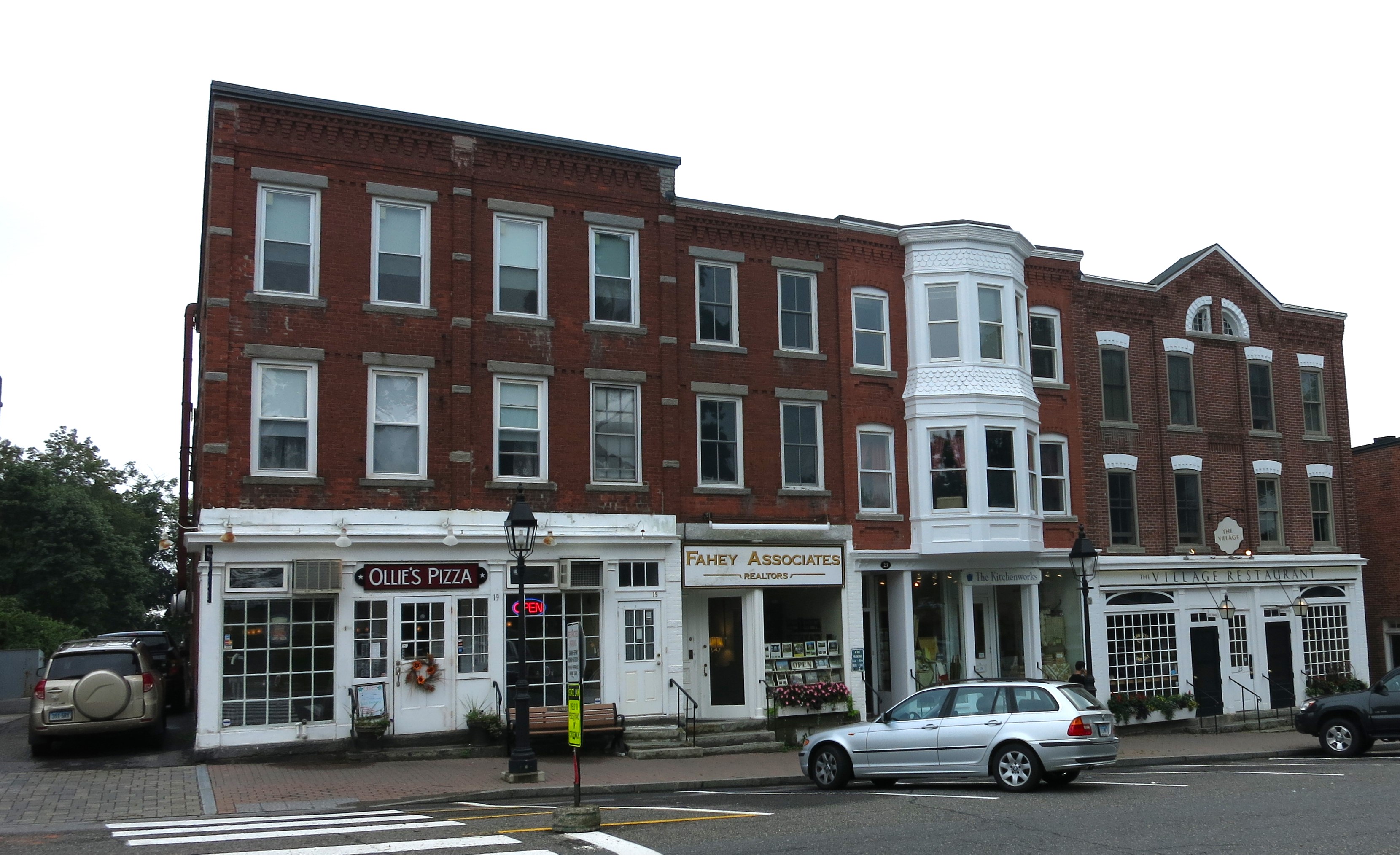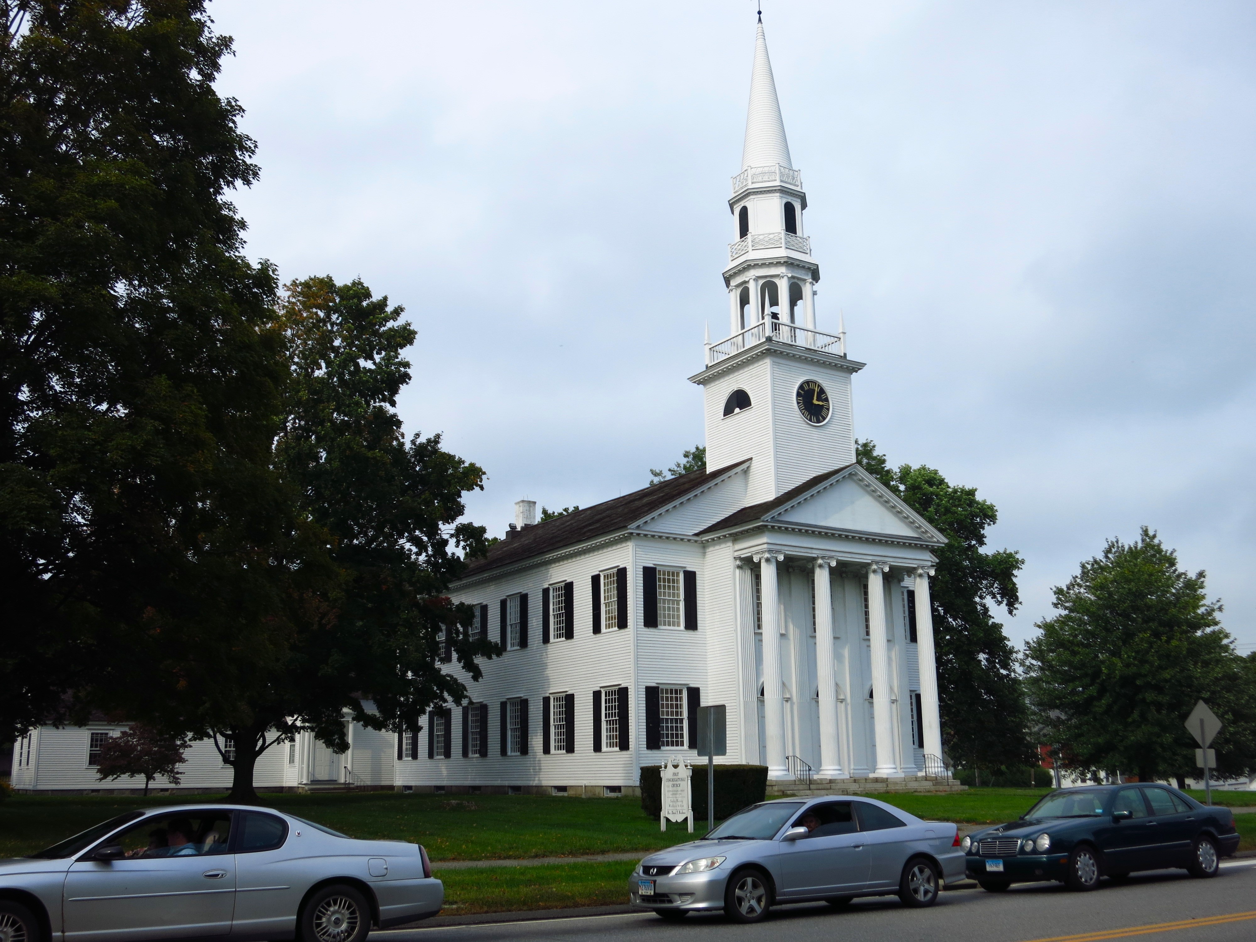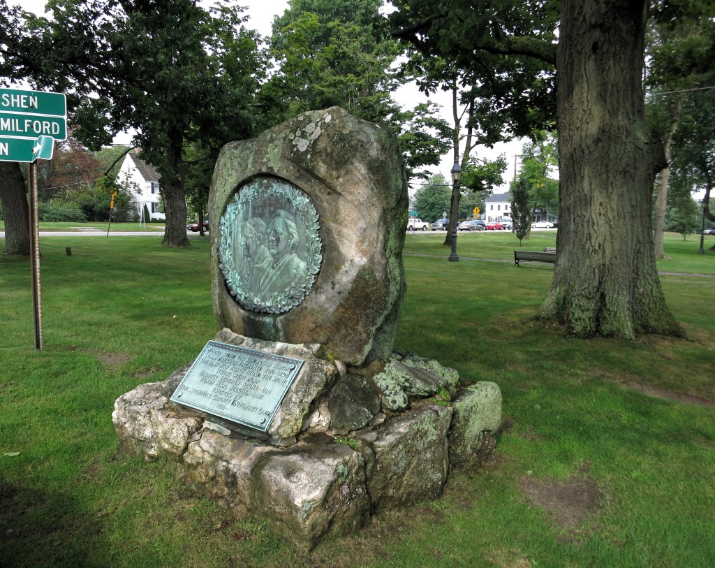 The old stones and plaque in the village green mark the site of Lyman Beecher’s church.