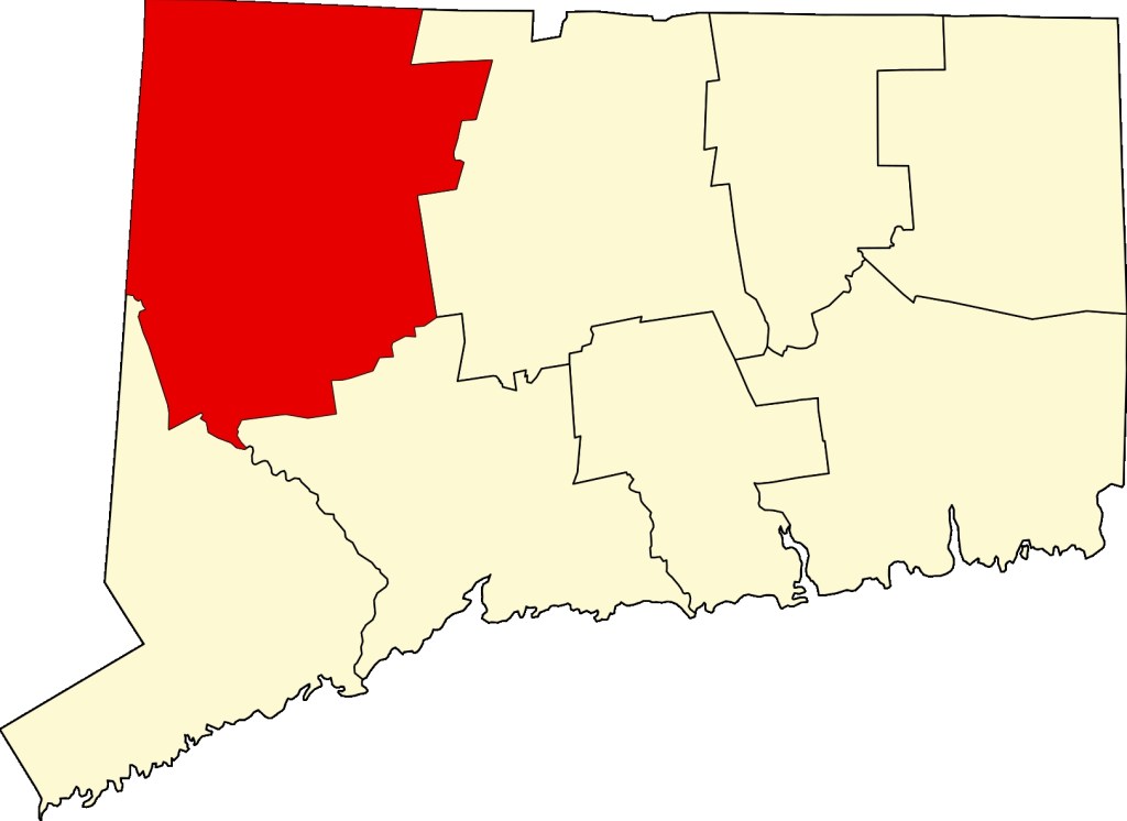 Finally, here are some notes about Litchfield County, Connecticut, and its government. The map below shows the state of Connecticut and its county lines, with Litchfield County shaded in red in the northwest corner of the state.