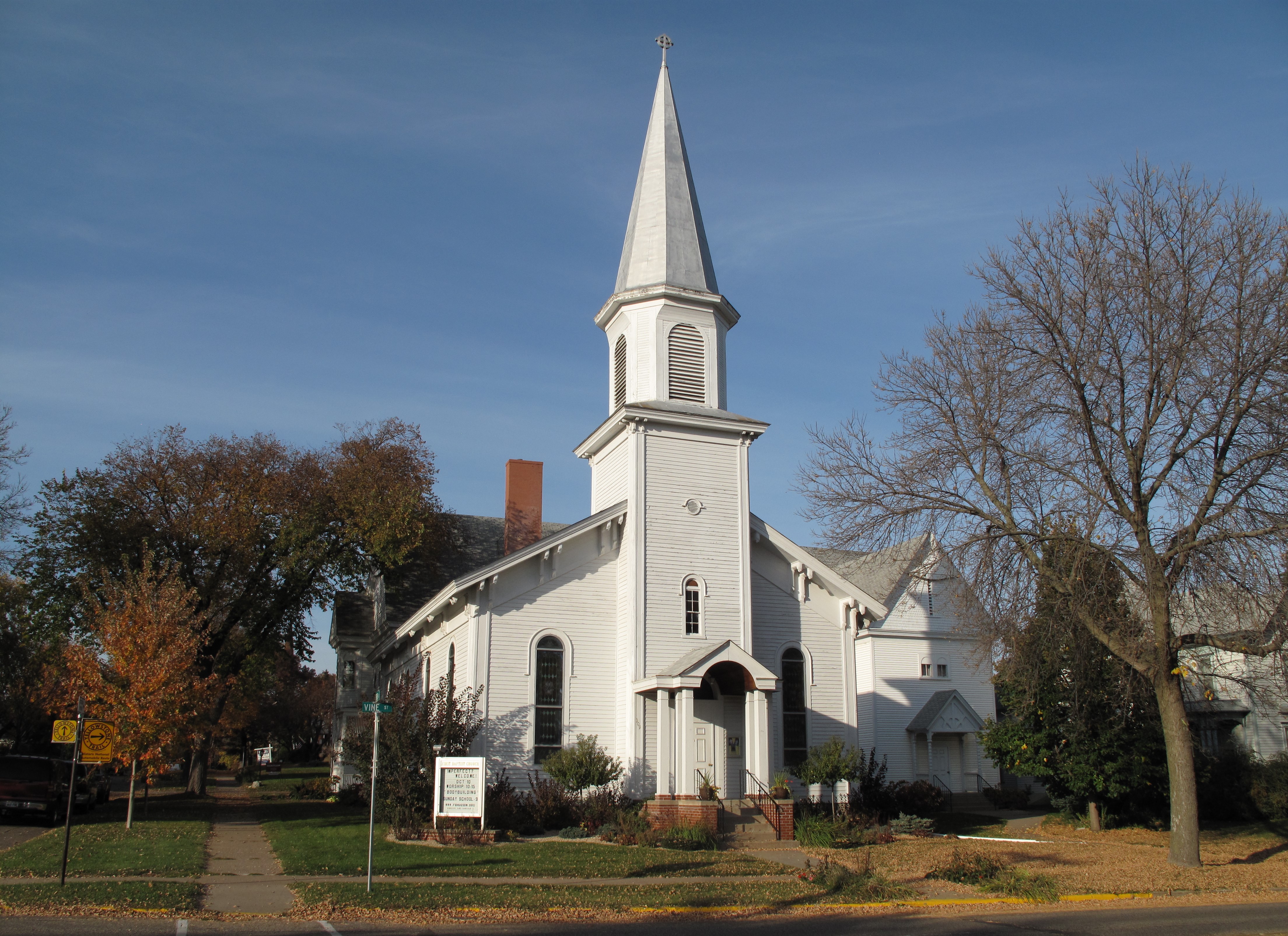 Below, clockwise from top left: a neighborhood church with a classic white steeple; a stately Victorian home; the old St. Croix County Courthouse and grounds; the same courthouse in greater detail showing its sandstone block construction and bell tower.