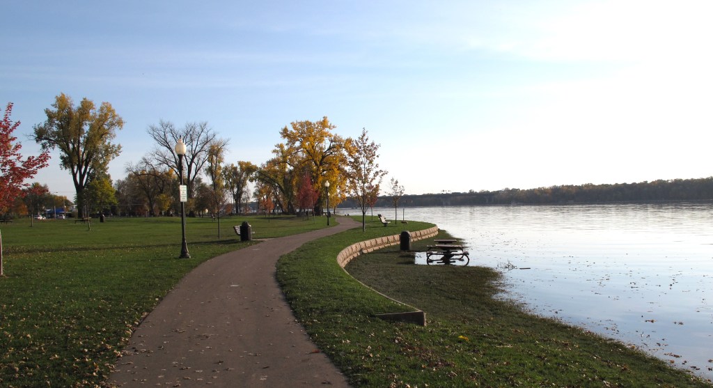 Putting off dinner for a while, I walked along Hudson’s St. Croix riverfront park area. Flowing north and south between Minnesota and Wisconsin, the St. Croix River spreads out as wide as a lake at this point. It then flows another 20 miles south to join the Mississippi River. Here are two photos of Lakefront Park along the St. Croix River: