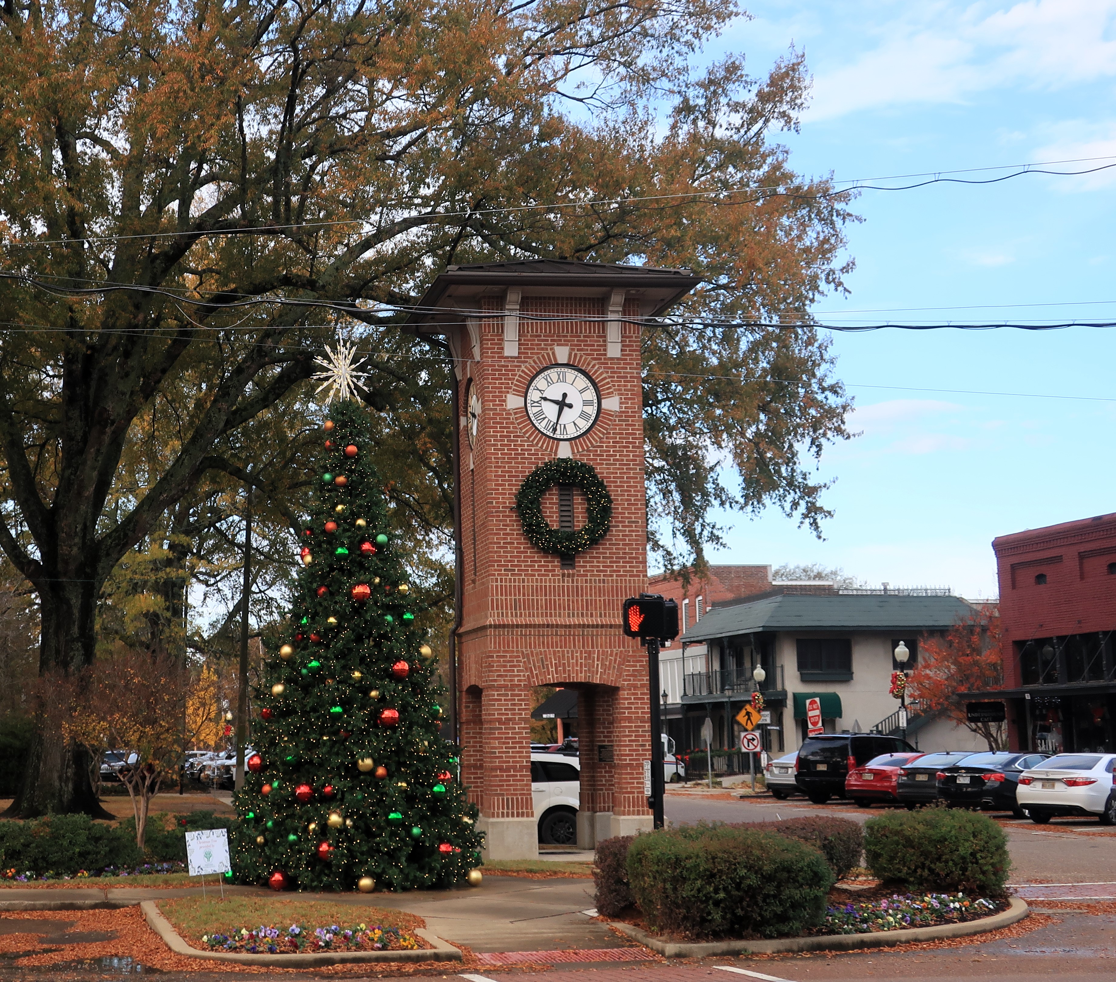 The clock tower and Christmas tree stand on the corner of the courthouse grounds.