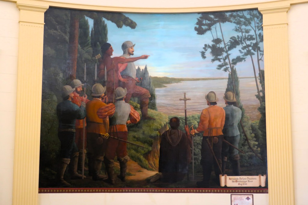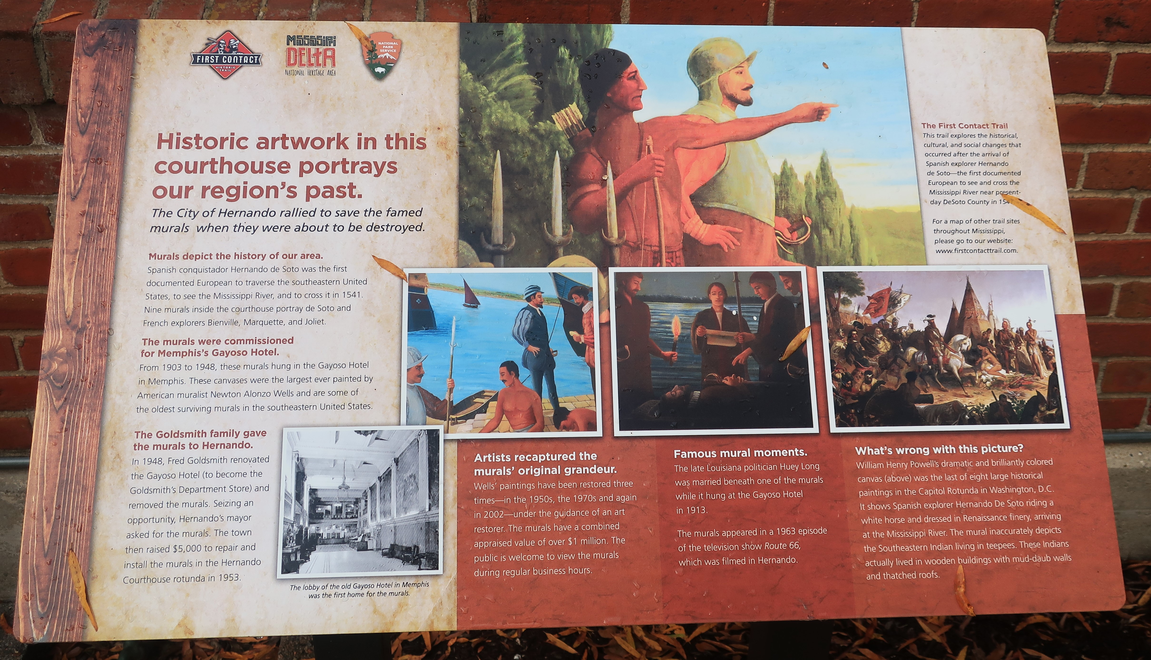 A historical sign near the courthouse entrance describes nine fascinating murals found inside the building. These murals depict the voyages of Spanish explorer Hernando de Soto in the southeastern United States, and they were initially created to be displayed at a luxury Memphis hotel. When the mayor of Hernando learned that the hotel was to be torn down, he purchased the murals and had them installed inside the courthouse.