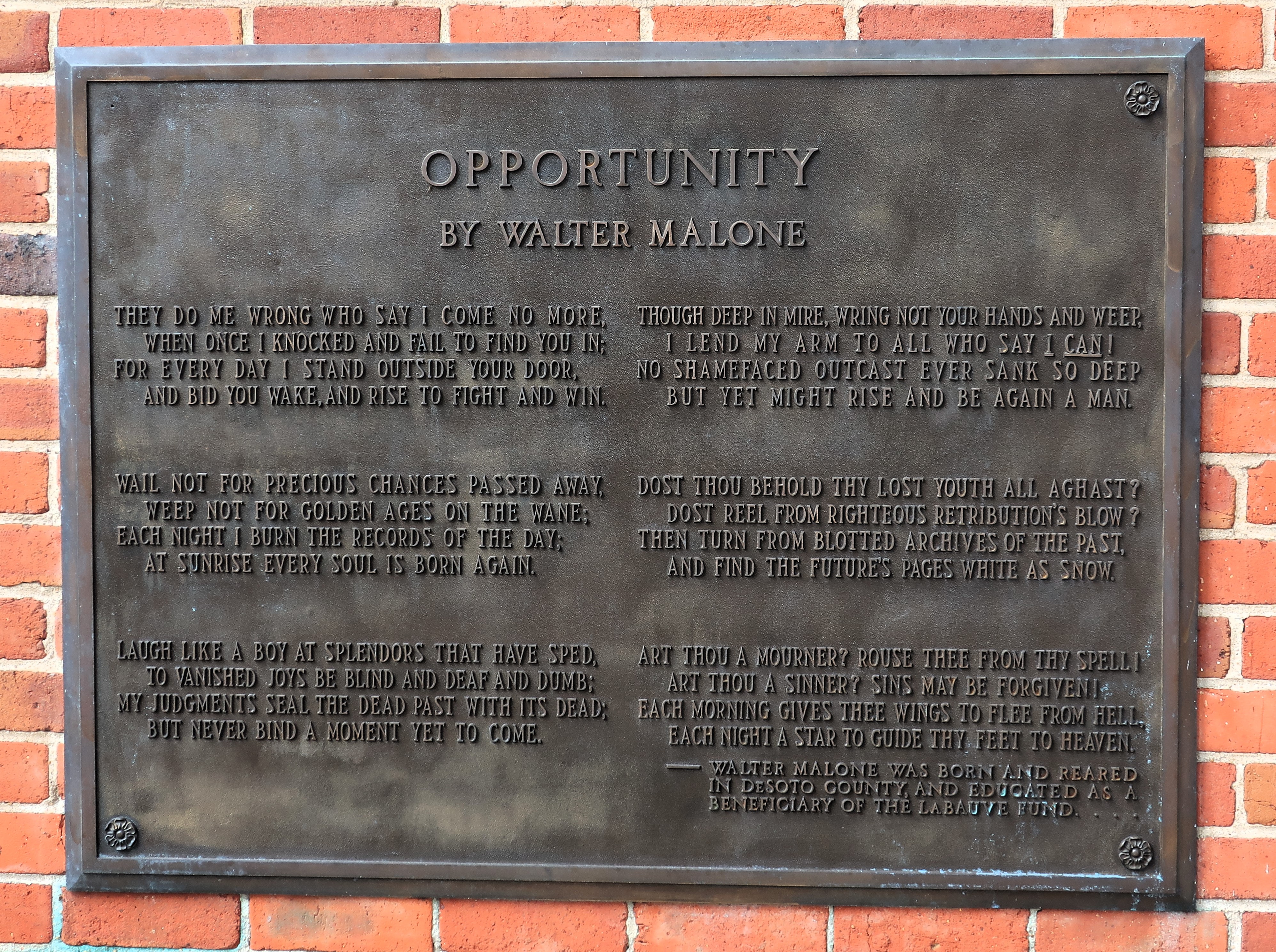 Finally, I saw some words of wisdom on a plaque attached to the courthouse walls. They come from Mr. Walter Malone, a native of DeSoto County, Mississippi, and are well worth your consideration.