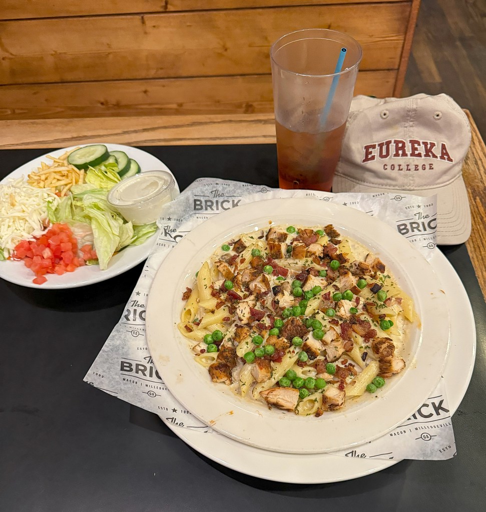No great day ends without a great dinner. If you’re ever in Milledgeville, do yourself a favor. Go to The Brick on East Hancock downtown. Order the “Park Slope” with penne, alfredo, jerk chicken, bacon, and peas. I added a salad on the side.
