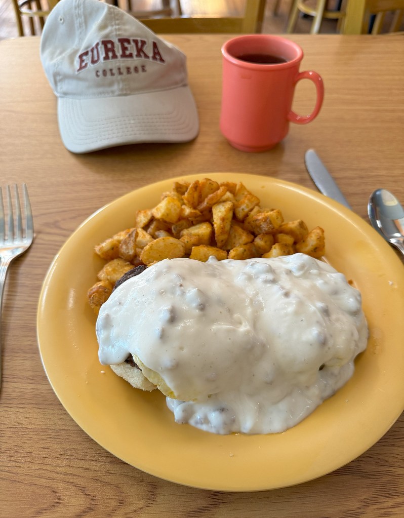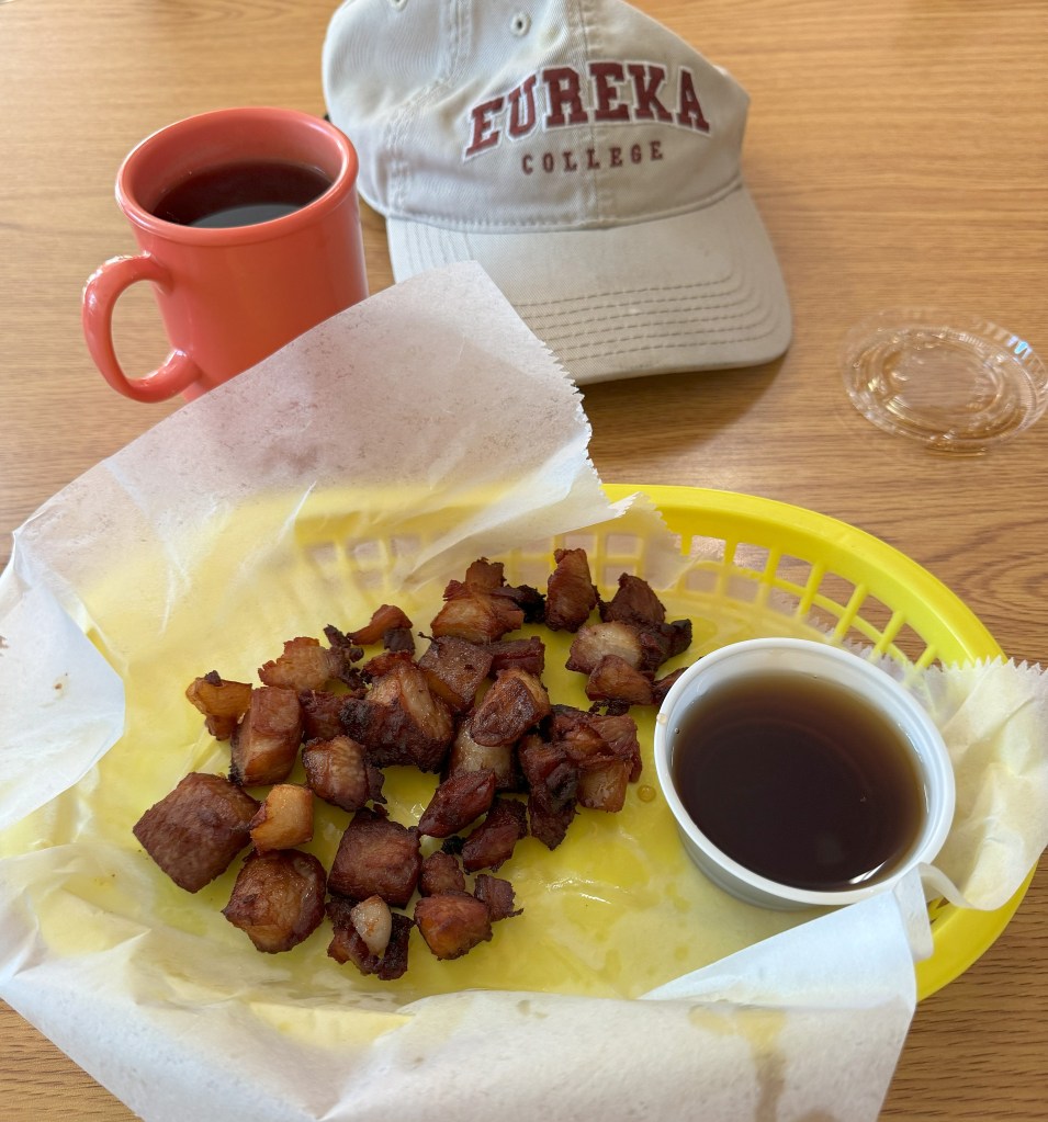 I had the Beauregard Benedict—two eggs, two sausage patties, and two buttermilk biscuits smothered in country gravy. Then to try something I’d never had before, I asked the waitress for some Pork Belly Bites. They’re great when dipped in maple syrup.