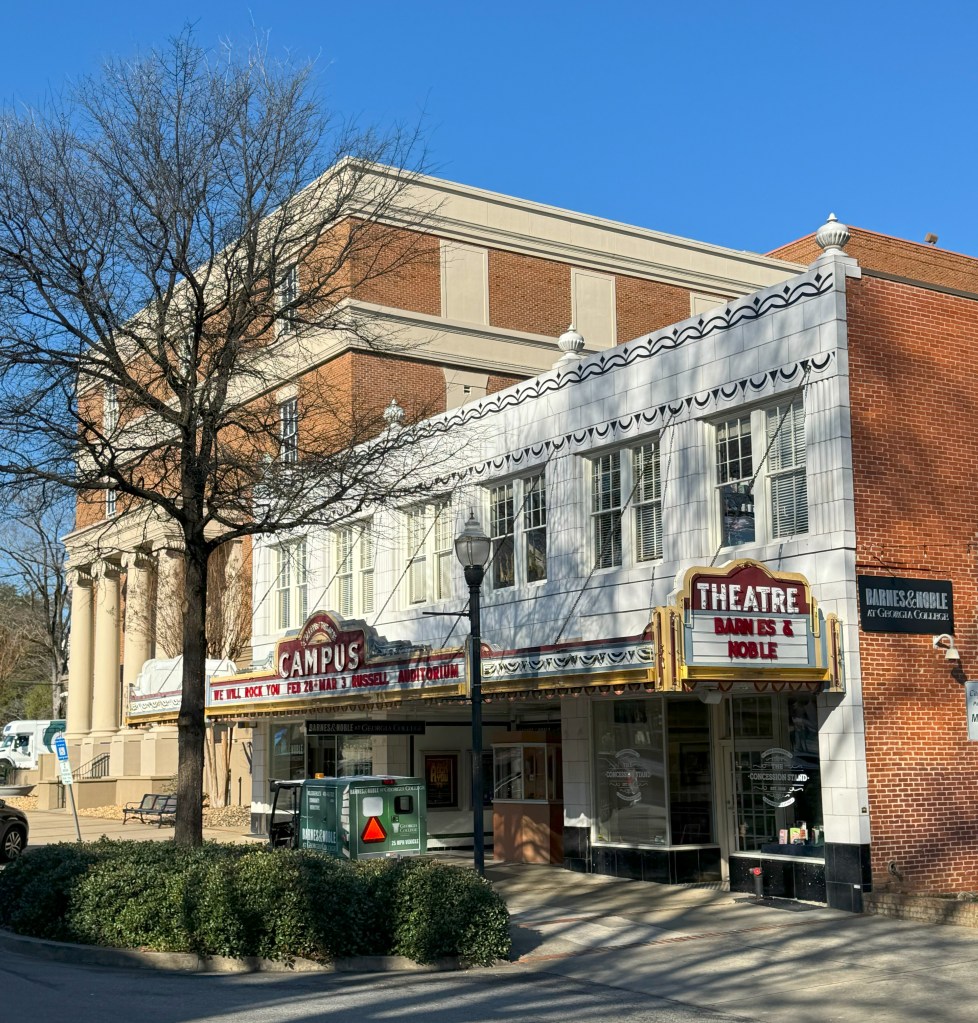 When I visit a town, I like to walk its downtown streets to get a feel for my surroundings. In Milledgeville, East Hancock Street runs through the downtown center. The area is bright and lively on a sunny January morning, even though its shade trees will be winter-bare for a few more weeks. Hancock has plenty of shops and restaurants, and the old Campus Theater is the centerpiece. A modern Barnes & Noble bookstore occupies part of the old movie house.