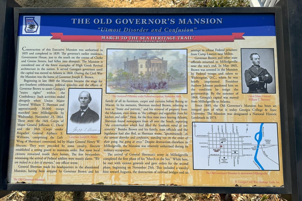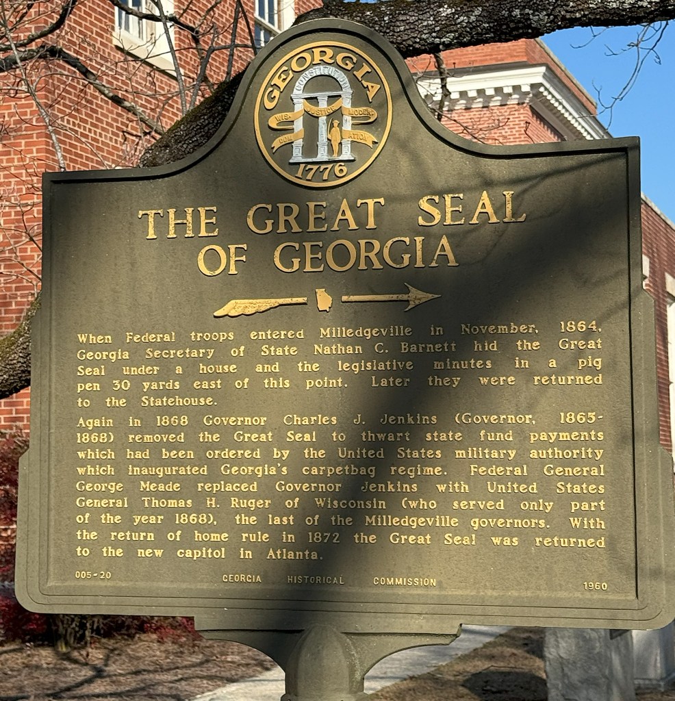 In the fall and winter of 1864, Union General William Tecumseh Sherman started out from Atlanta on his great “March to the Sea.” Milledgeville was directly in the path of his armies. Below, a state historical sign explains how the Georgia Secretary of State hid Georgia’s great seal in a nearby pig pen.
