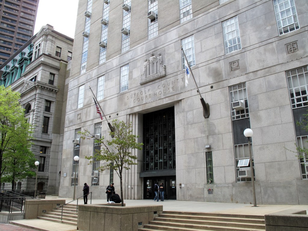 The Suffolk County Courthouse reminds me of Manhattan’s New York County Courthouse. It’s huge, maybe 15 stories, and some windows have little a/c units.  The jail might be inside as well. The old John Adams Courthouse next door is a five- or six-story building with a French-style roof. I believe the state Supreme Court resides inside.