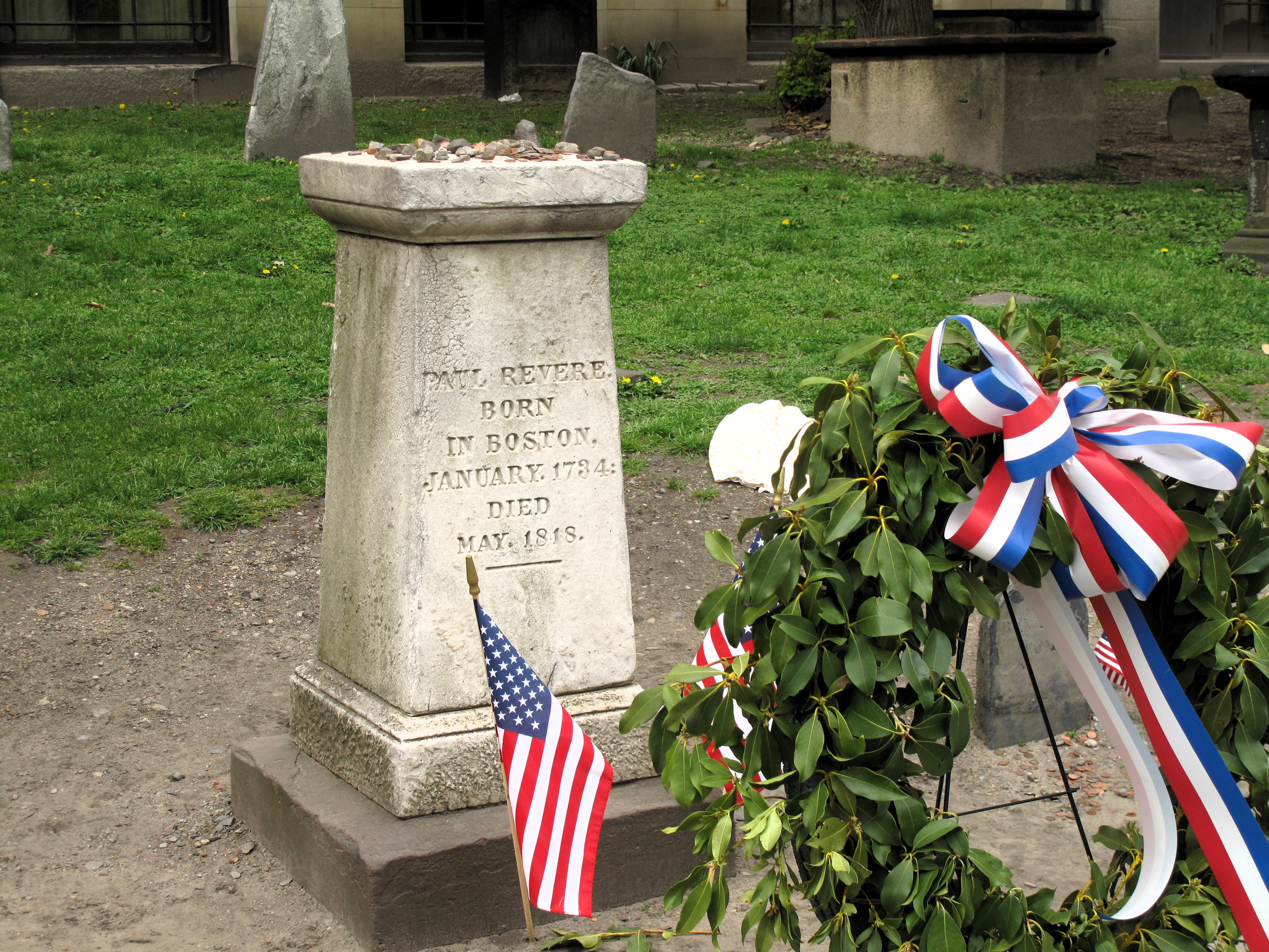 Below (clockwise from top left): Samuel Adams, George Washington (of Virginia), the grave of Paul Revere, the grave of Samuel Adams, Benjamin Franklin (of Pennsylvania), and Alexander Hamilton (of New York).