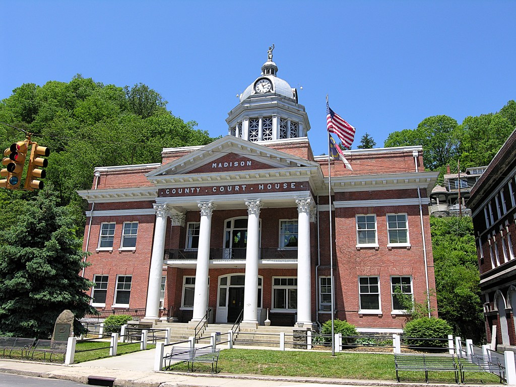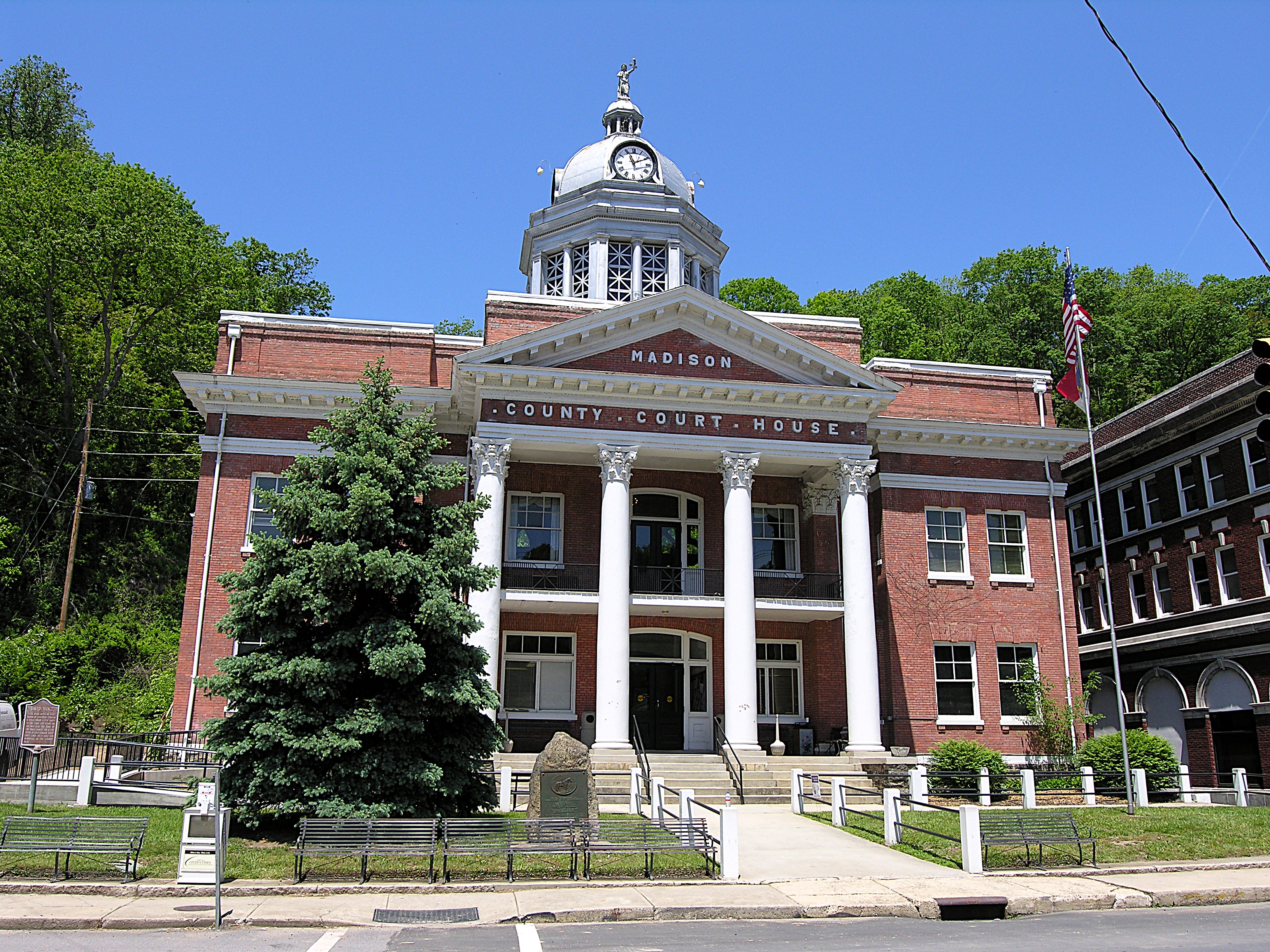 The Madison County Courthouse was constructed in 1907. It’s an old brick building of only two stories with a silver cupola. A statue of Lady Justice tops the cupola while classical pillars guard the front entrance. Like many buildings in the mountains, the courthouse is built into the side of a hill, and there is no back entrance.