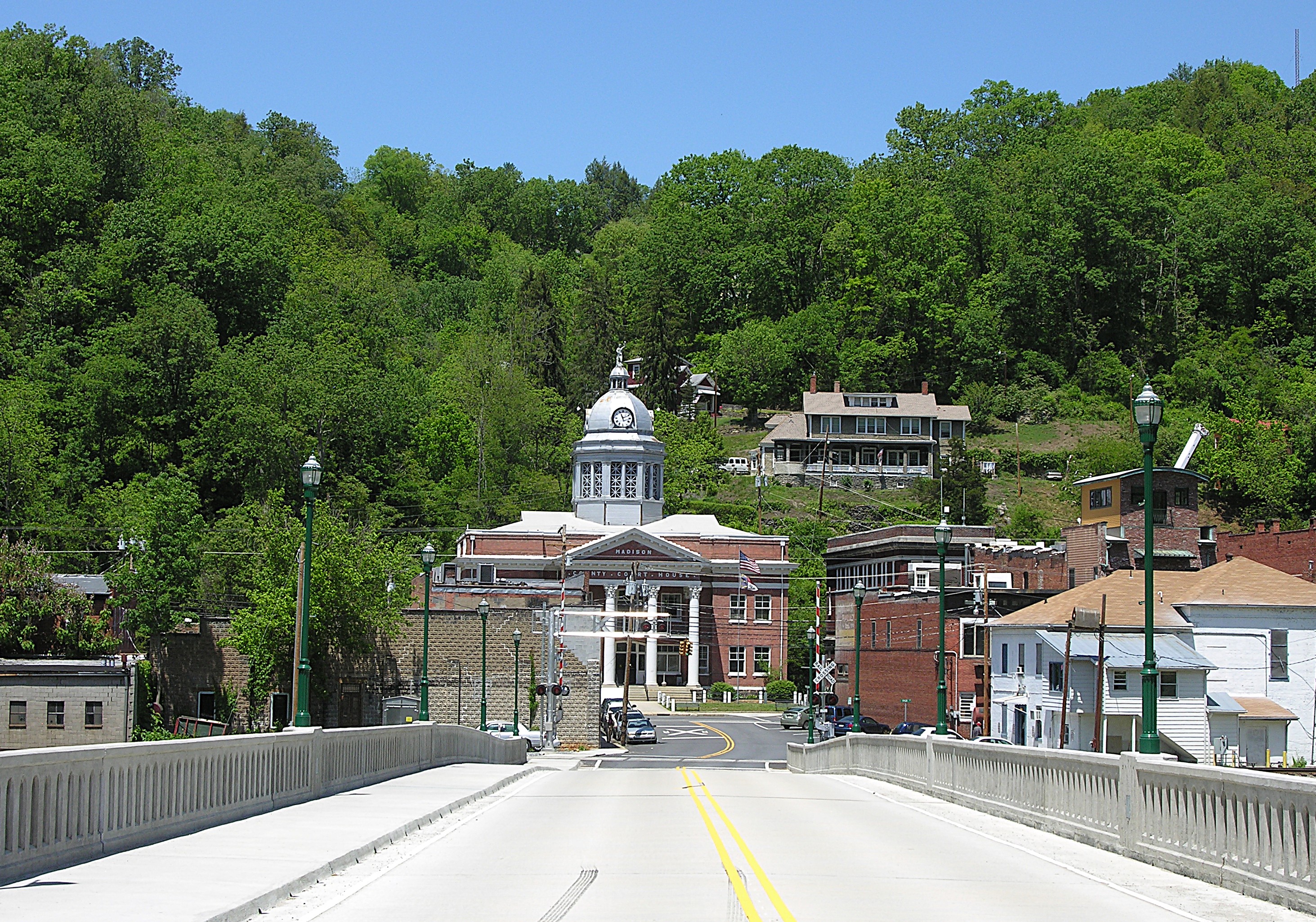 The courthouse faces the only bridge in town that crosses the French Broad River in this mountainous area. The French Broad is an odd river; it rises along the North Carolina ridges that mark the Eastern Continental Divide and flows west, past Asheville, North Carolina, through Marshall, and then on to Knoxville, Tennessee, where it meets the Holston to become the Tennessee River.
