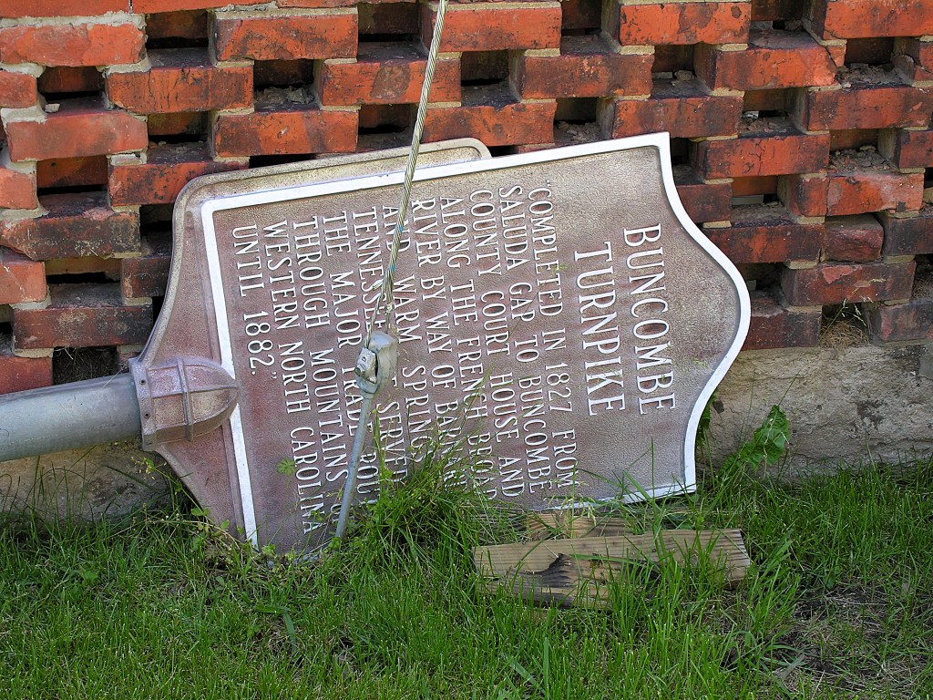 A fallen sign marks the old Buncombe Turnpike, which once connected Charleston, South Carolina, to western North Carolina, Tennessee, Kentucky, and the lower Mississippi River Valley. Also called the Old Buncombe Road, the pathway was begun in the 1820s as a wagon road. Traffic on the route was replaced by railroads in the 1880s.
