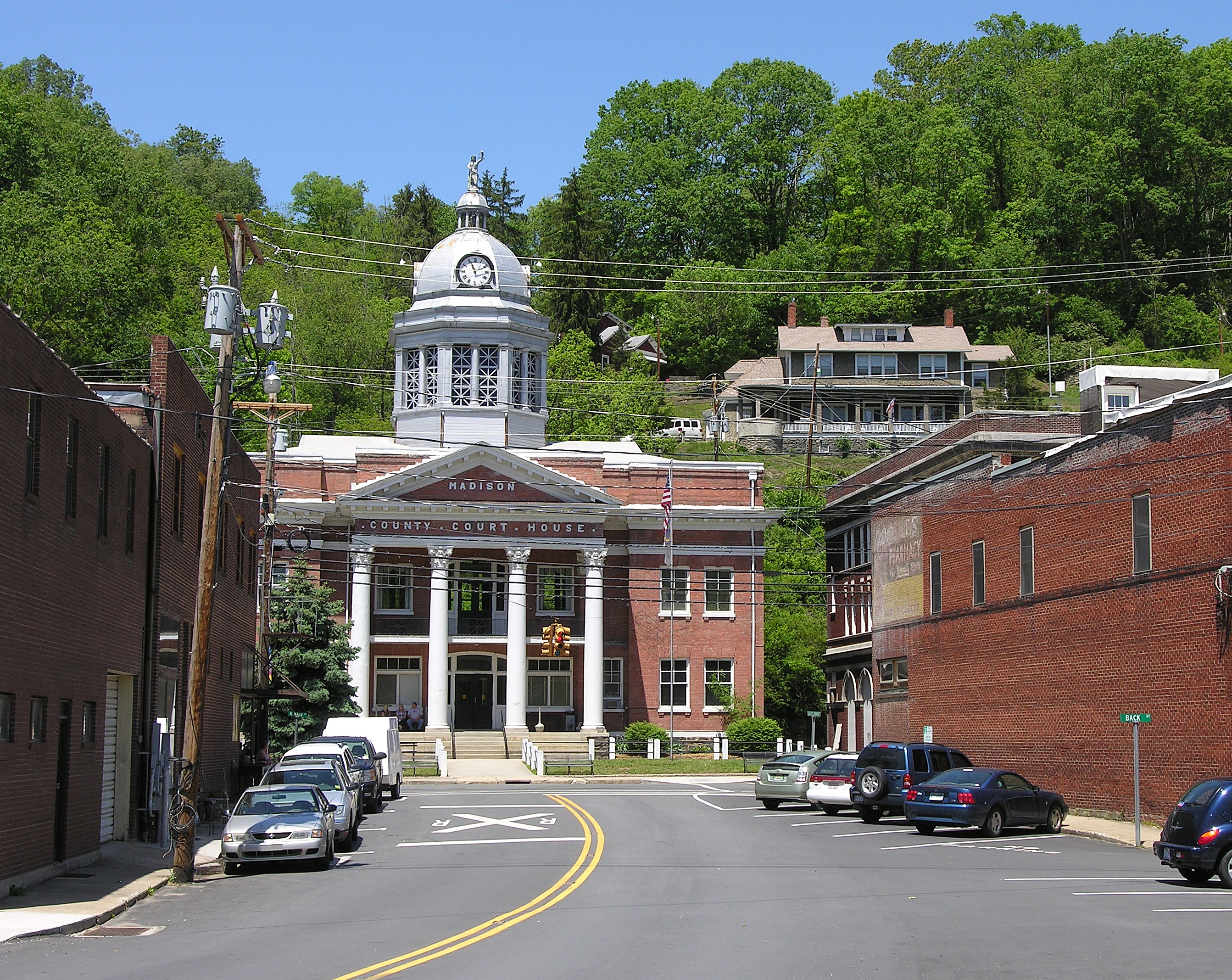 The Madison County Courthouse was constructed in 1907. It’s an old brick building of only two stories with a silver cupola. A statue of Lady Justice tops the cupola while classical pillars guard the front entrance. Like many buildings in the mountains, the courthouse is built into the side of a hill, and there is no back entrance.