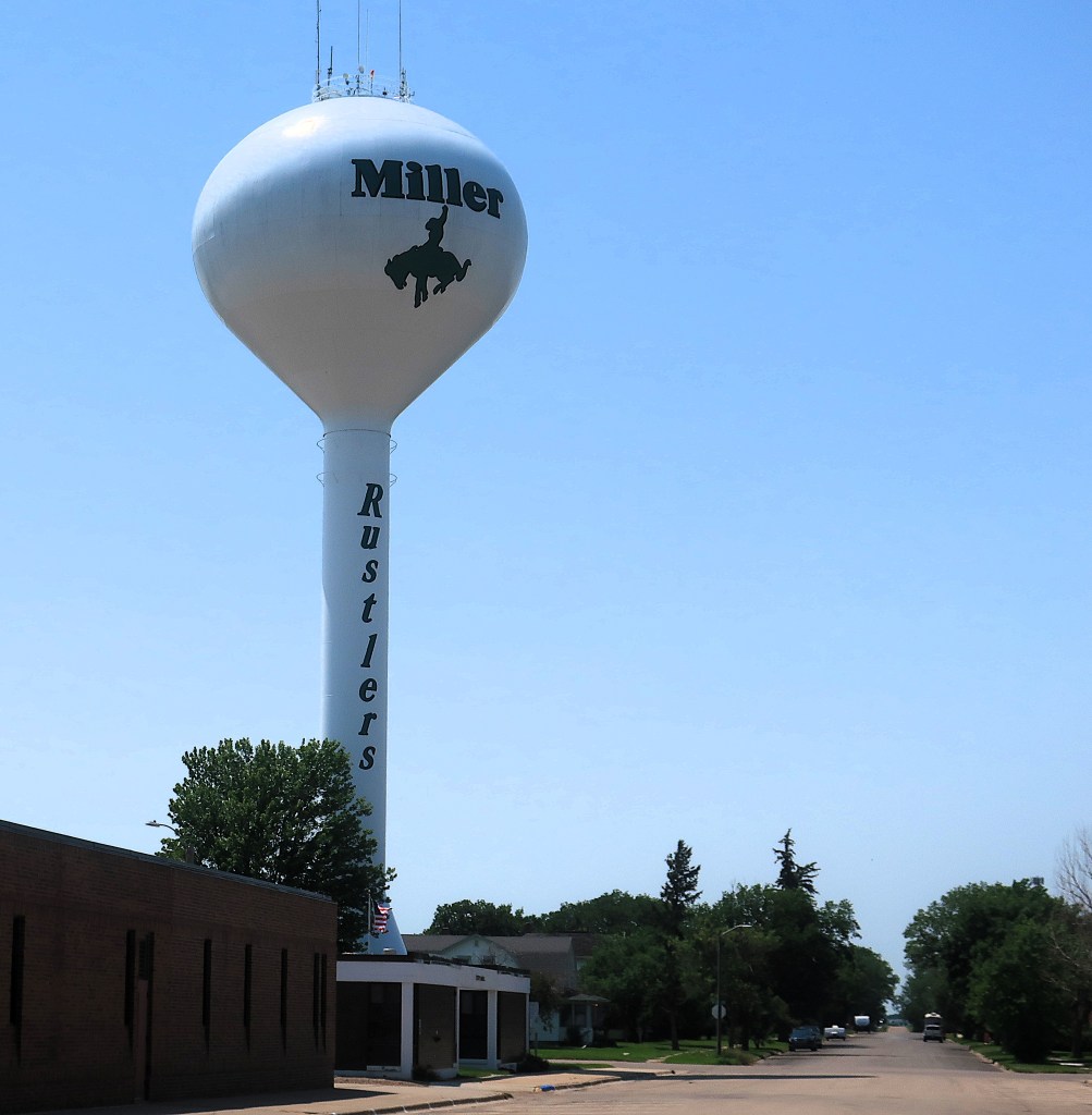 Miller’s giant water tower proclaims this burg to be the home of the “Rustlers.” The lettering and the cowboy icon are green like the surrounding grain fields. Over the years, Miller has produced a state governor and a few other notables. These days, Miller is a town of two business blocks and thirteen hundred occupants.