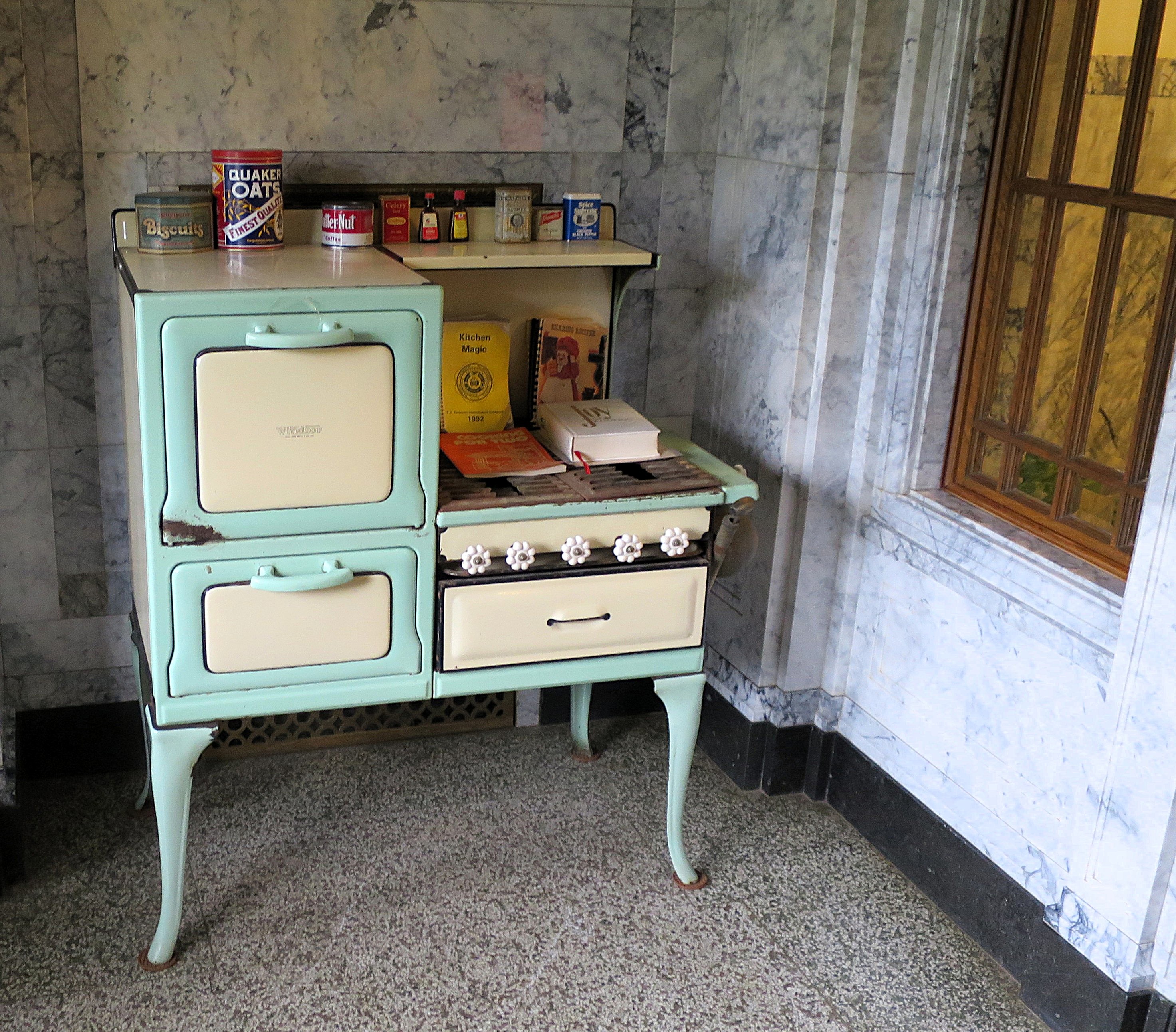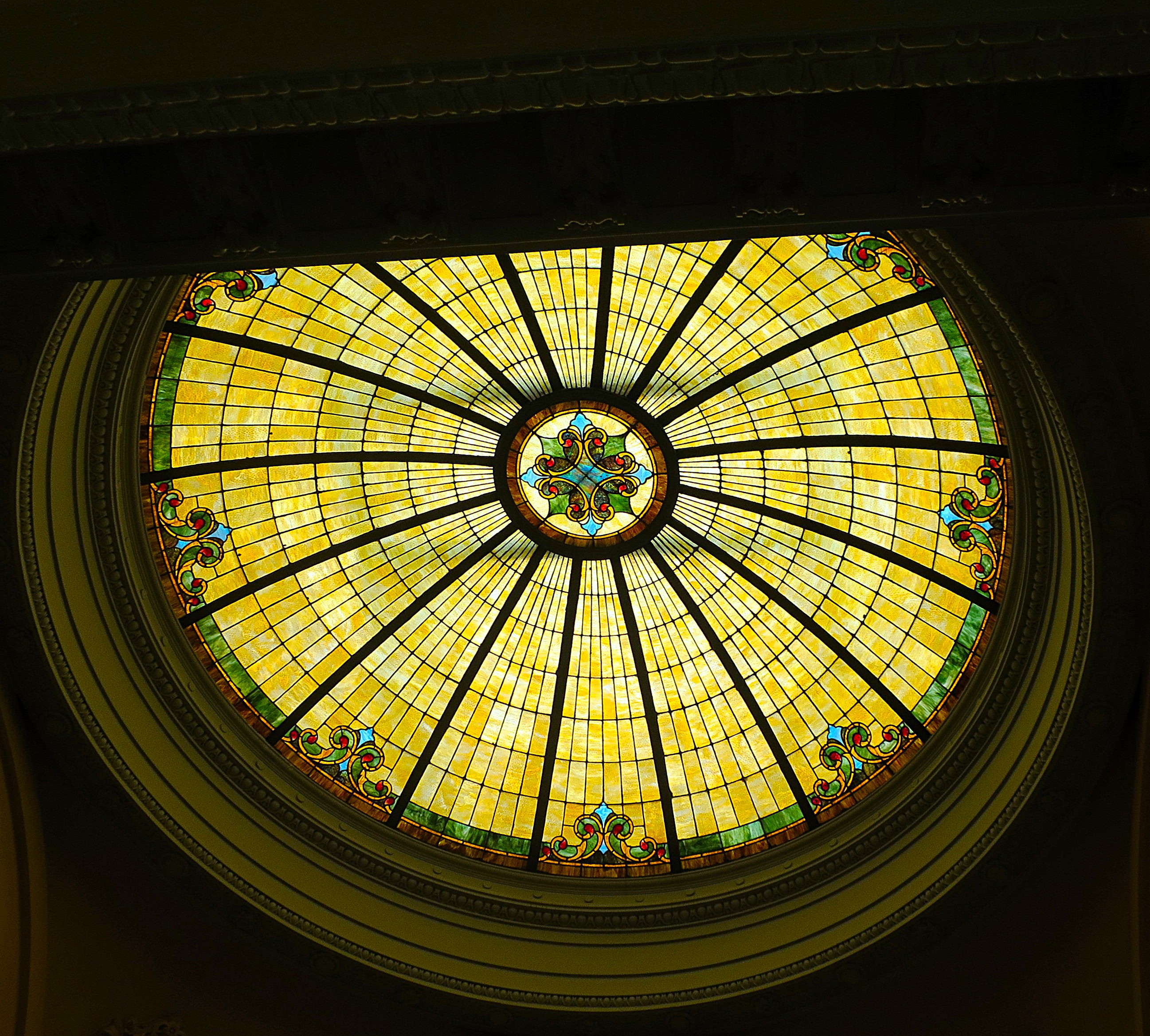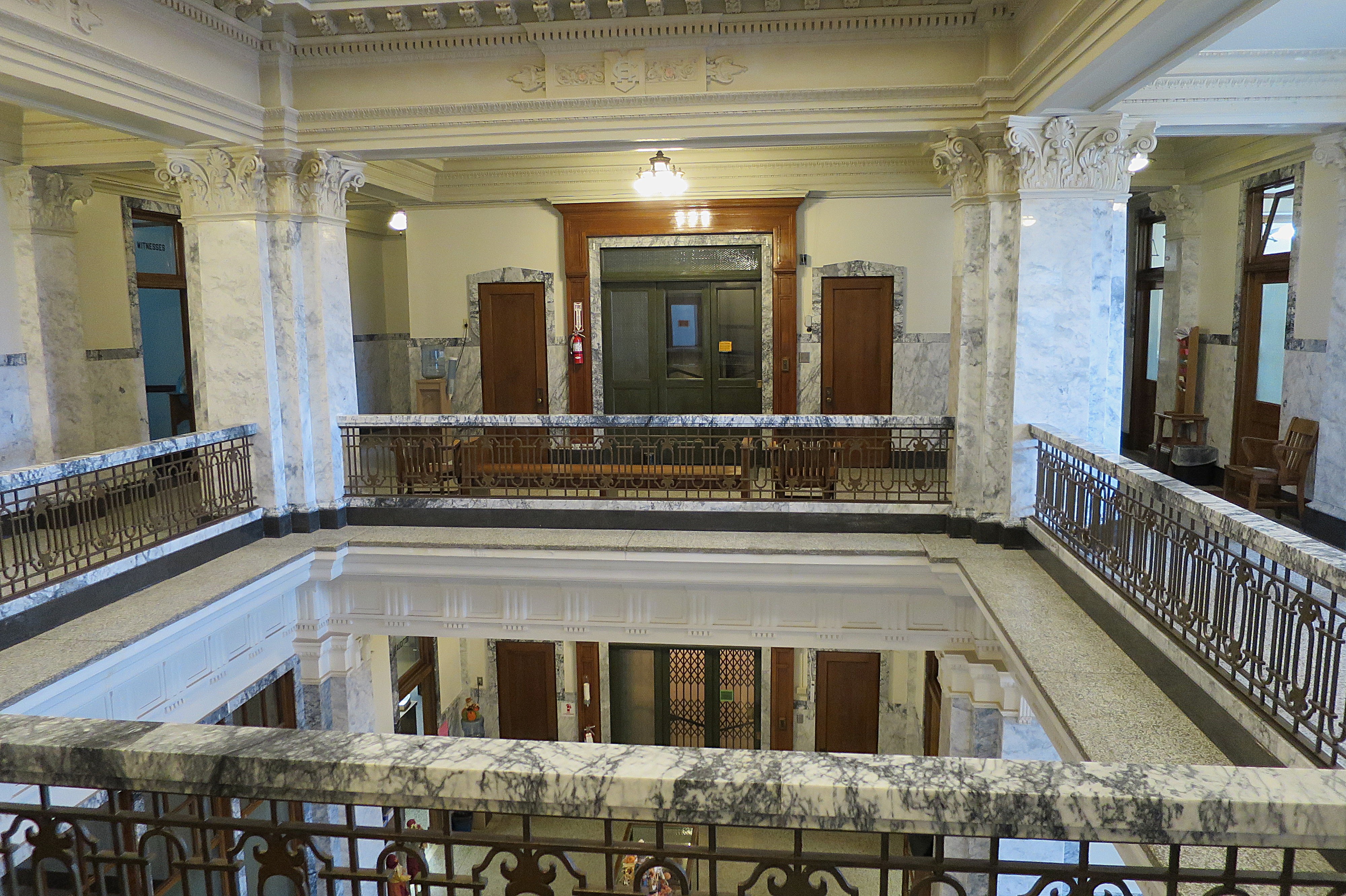 Carved marble walls and stairways fill the courthouse’s interior. The stained-glass ceiling and the old-fashioned elevator are both time pieces of neo-classical design of the 1920s. Whenever I see the prolific use of marble in courthouses (and I’ve seen it often in 1920s courthouses), I’m awestruck at how expensive and investment it must have been. It’s all beautiful and magnificent, but sadly such decor is a relic of a bygone era — it would be of the question to build in such a manner today.