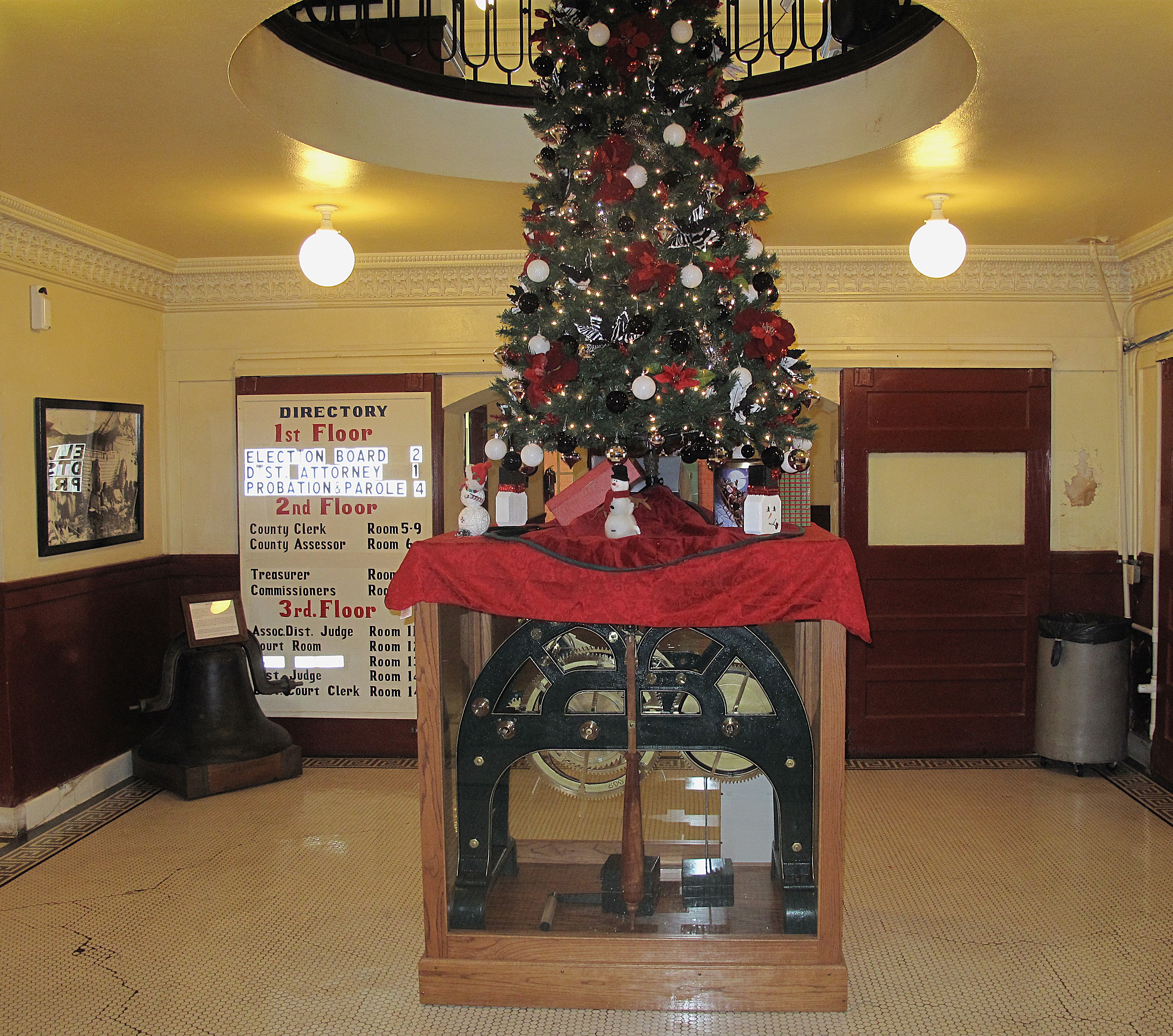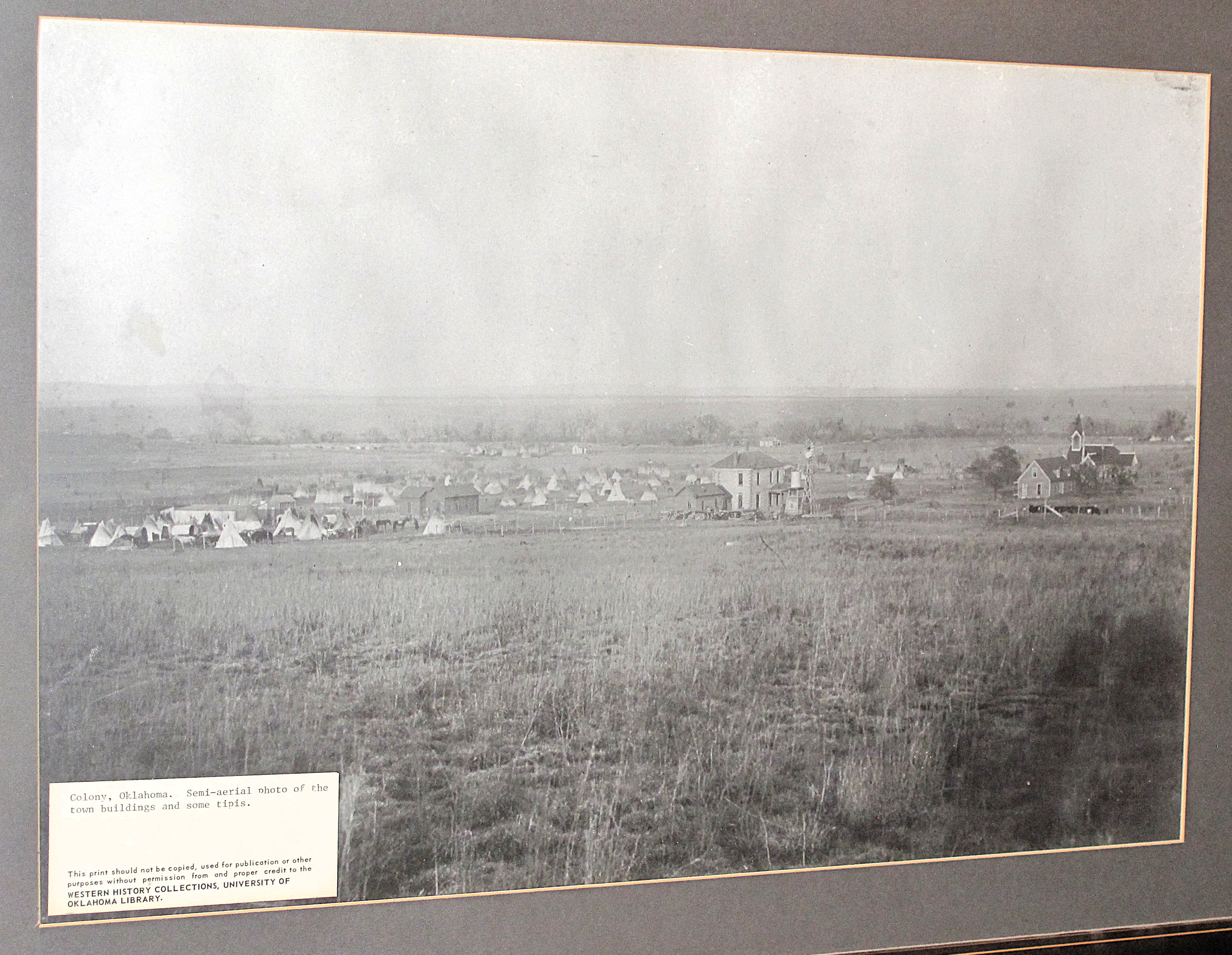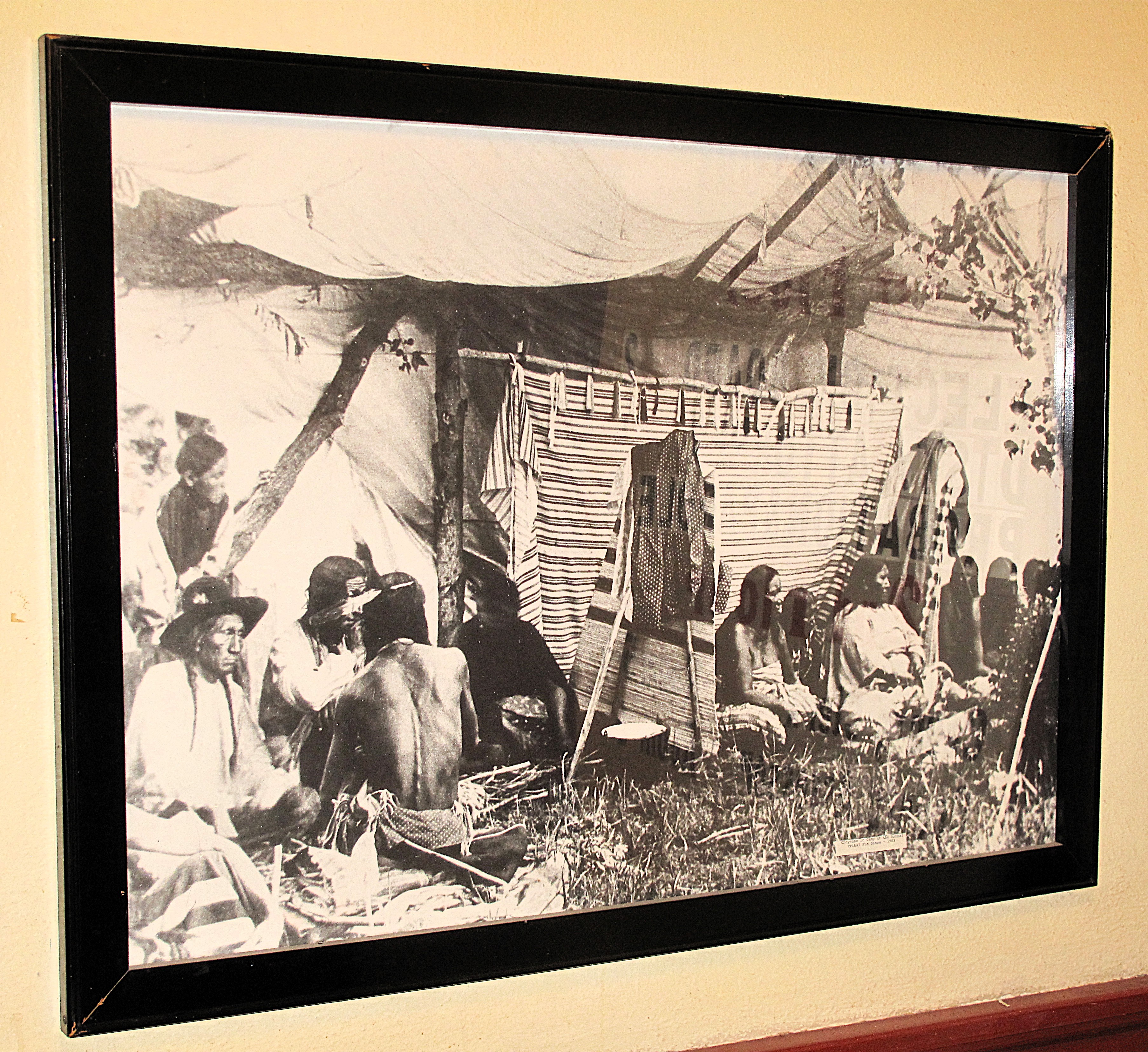 Below: Christmastime inside the Washita County Courthouse. The two black-and-white pictures on the right were taken around 1910 and depict Native Americans from the Cheyenne or Arapaho tribes; the top-left picture shows teepees dotting the plains. Back then, the Cheyenne tribe held their annual sun dances dressed in white linen shirts and cowboy hats.