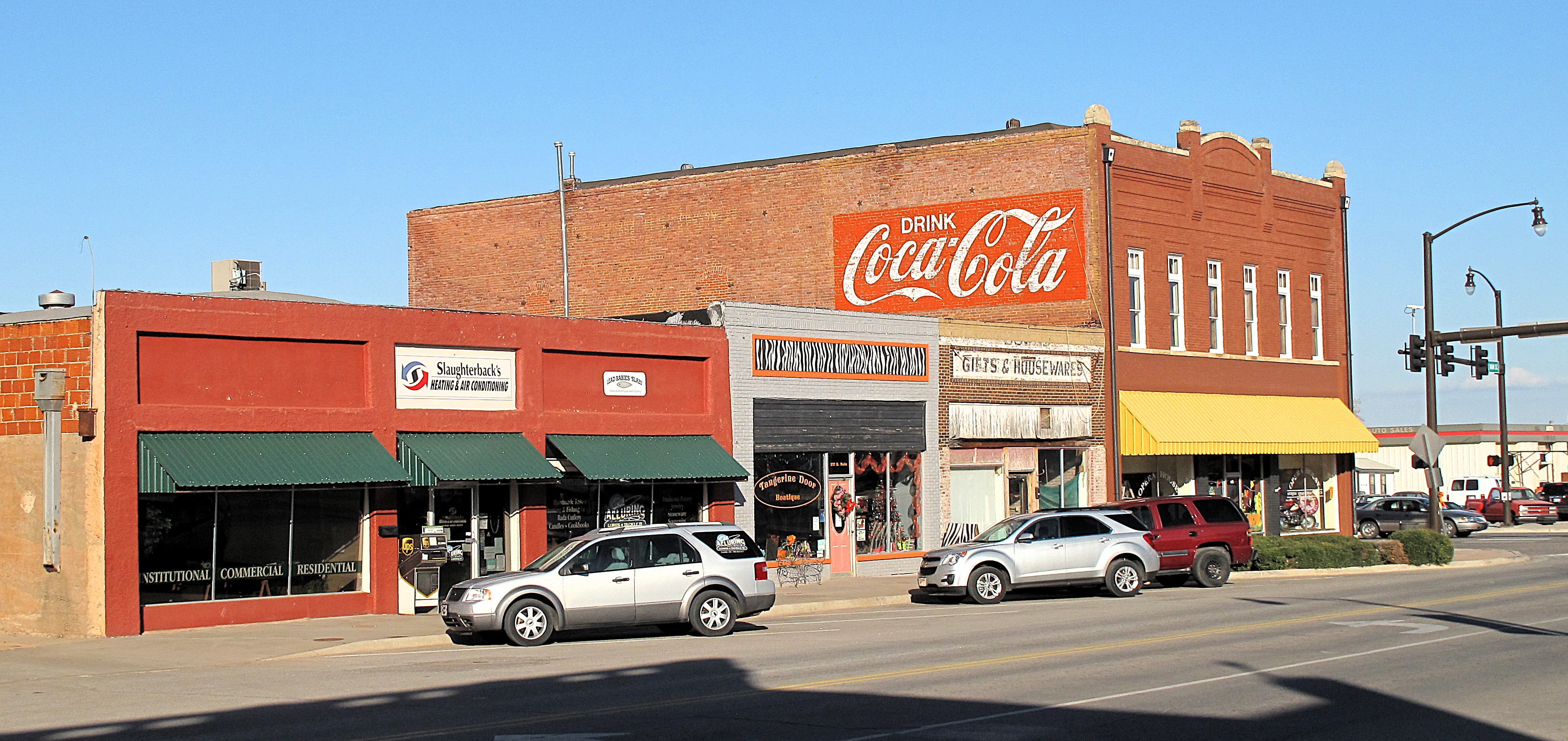 Below: the two-story business district in downtown Cordell, Oklahoma.