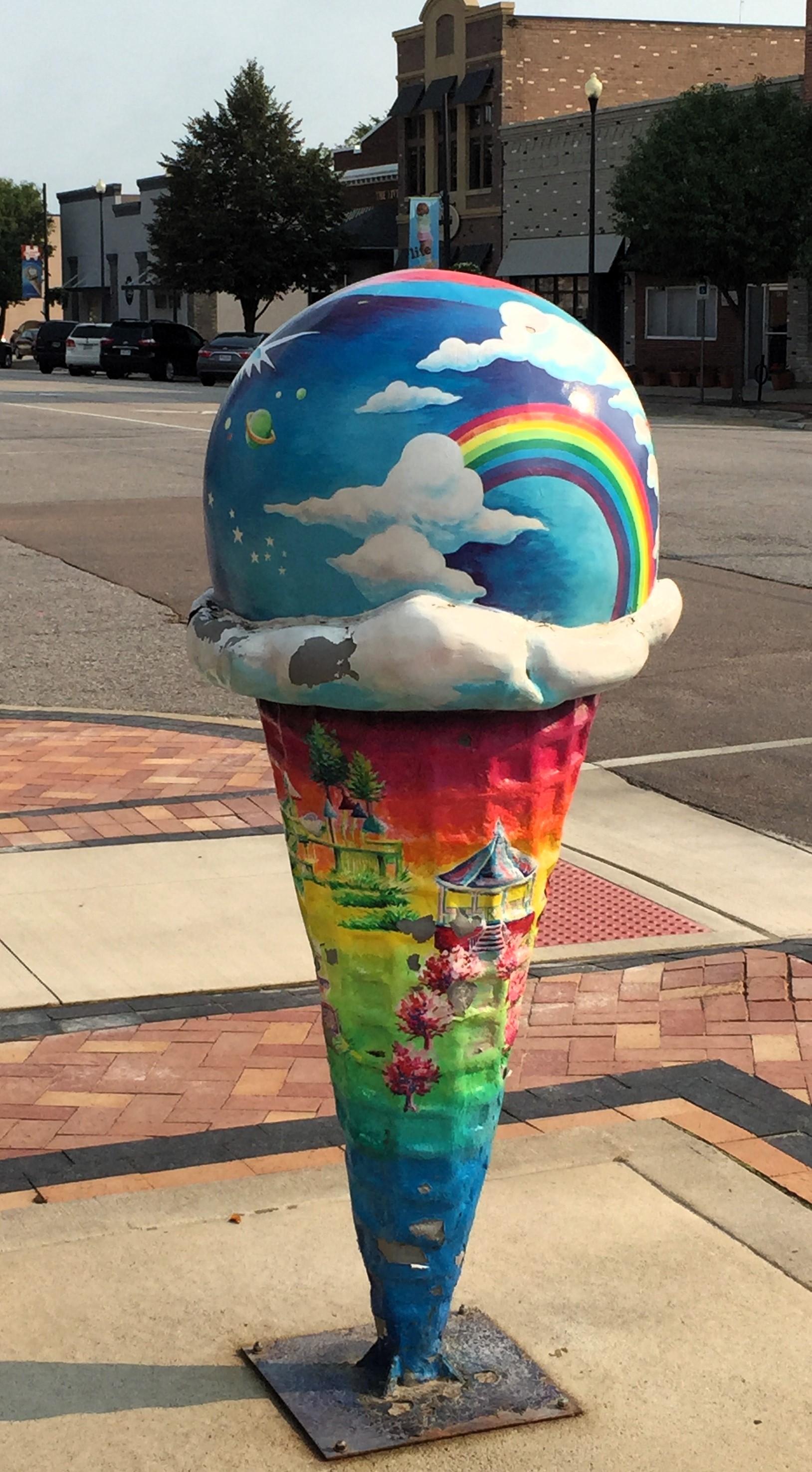 Below: Some of Ashland’s faces can be found painted on its downtown streets. The image at the bottom right shows the view down Main Street.