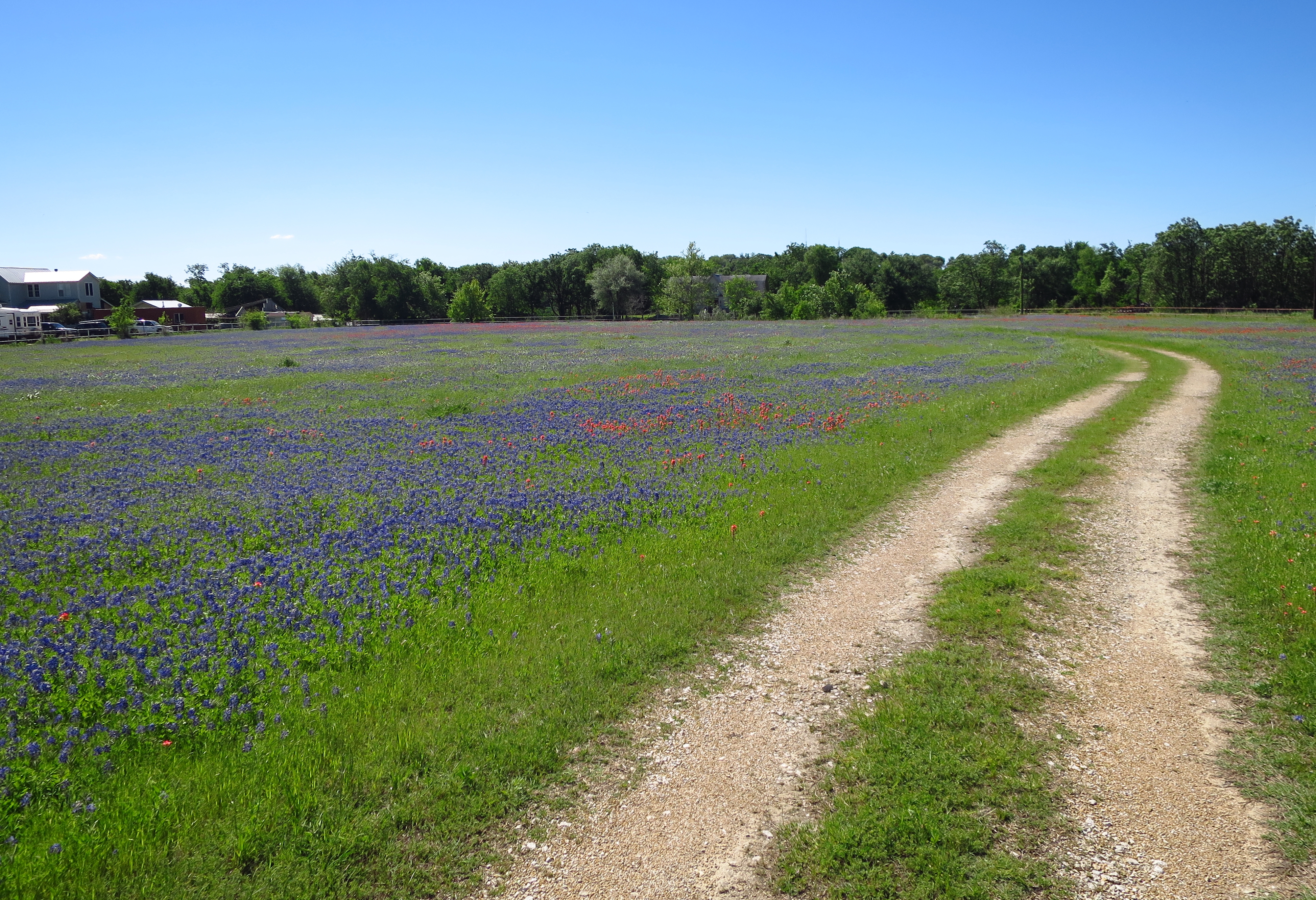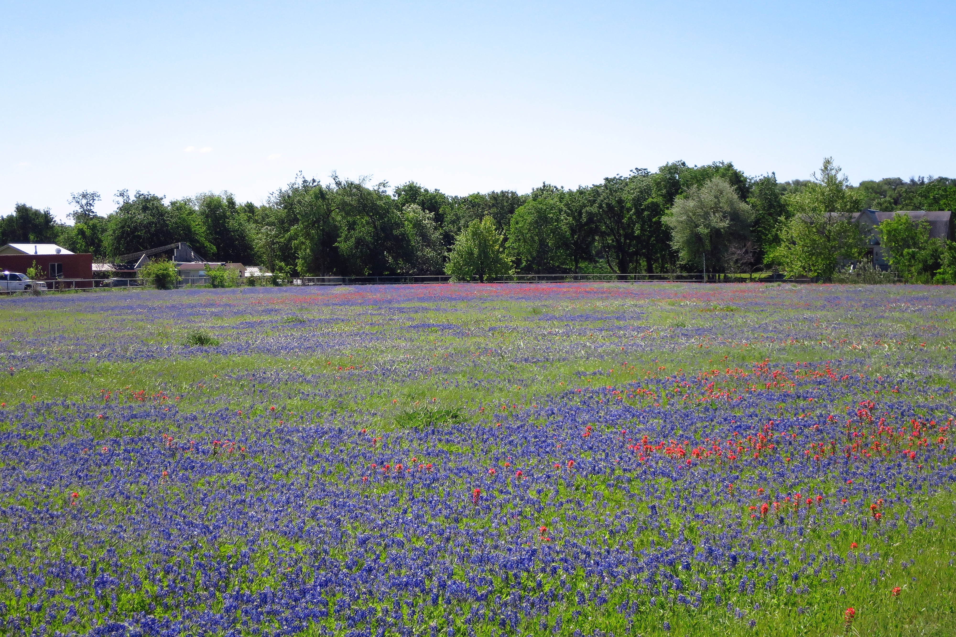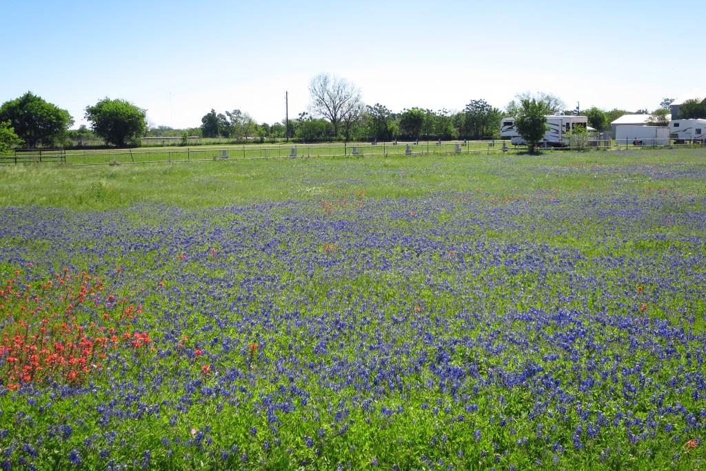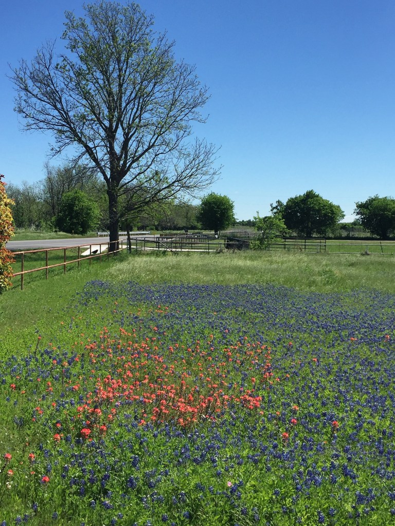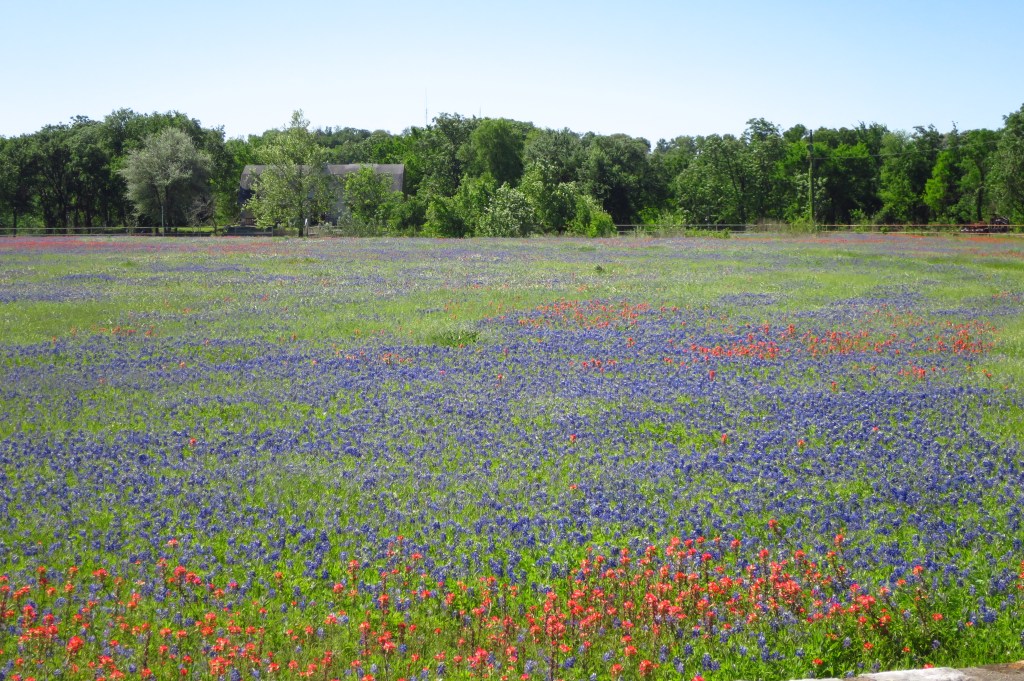 Texas Highways magazine has an excellent run-down of the various wildflowers in the state here. Two varieties predominate in Central Texas, the bluebonnet and the (red) Indian paintbrush. They bloom in late March and early April and are easily found along rural highways in central Texas, including Williamson County, north of Austin. Here are a few more photos:
