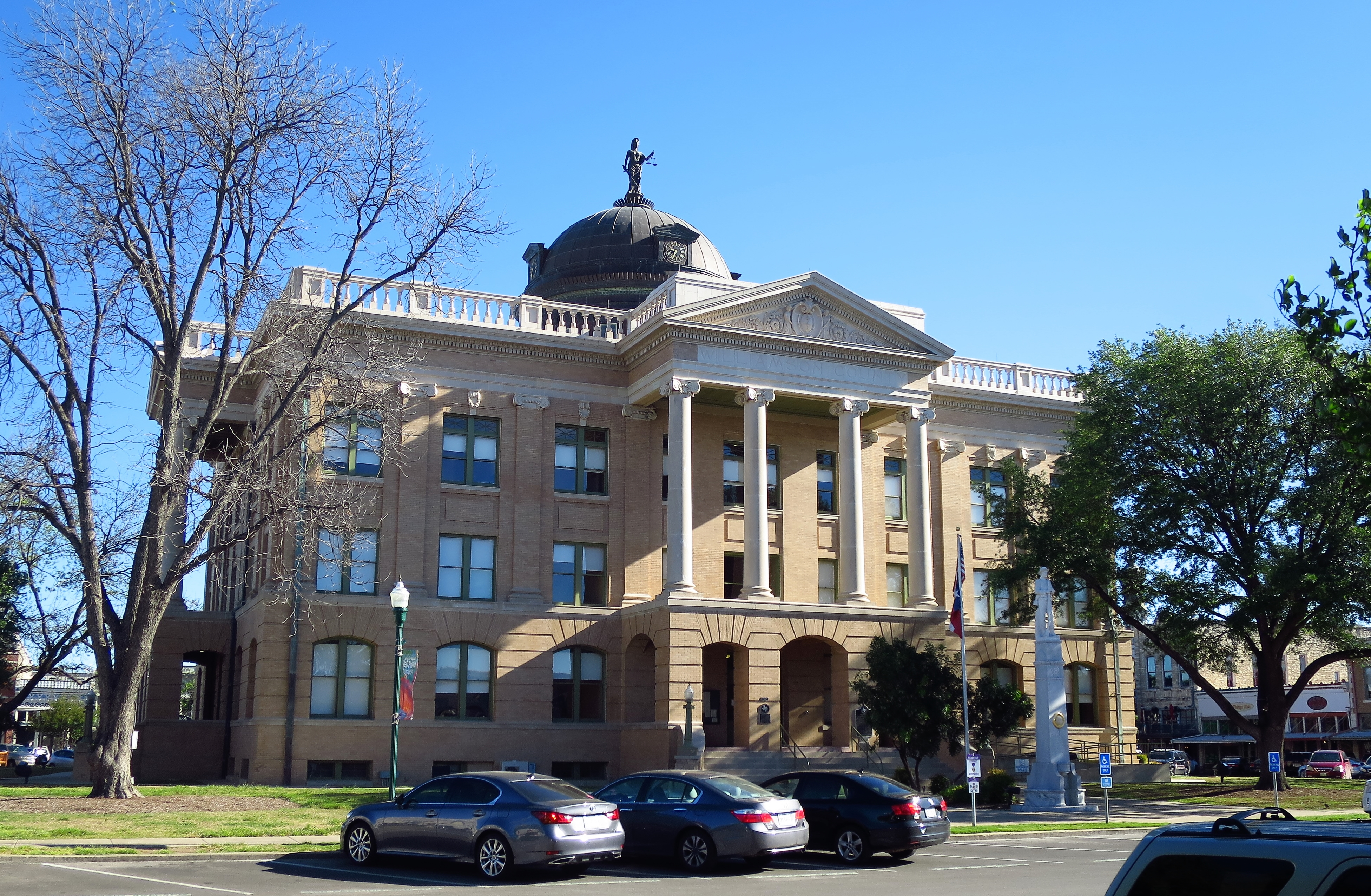 Williamson County is now too big a place to be using its old courthouse anymore, so a modern Justice Center has been built to replace the old courthouse. Six or seven blocks away, the old courthouse still stands in the center of the town square, easily found by its metal dome rising above the surrounding two-story buildings. This grand three-story yellow brick structure is preserved well and well-renovated and erected in 1910.