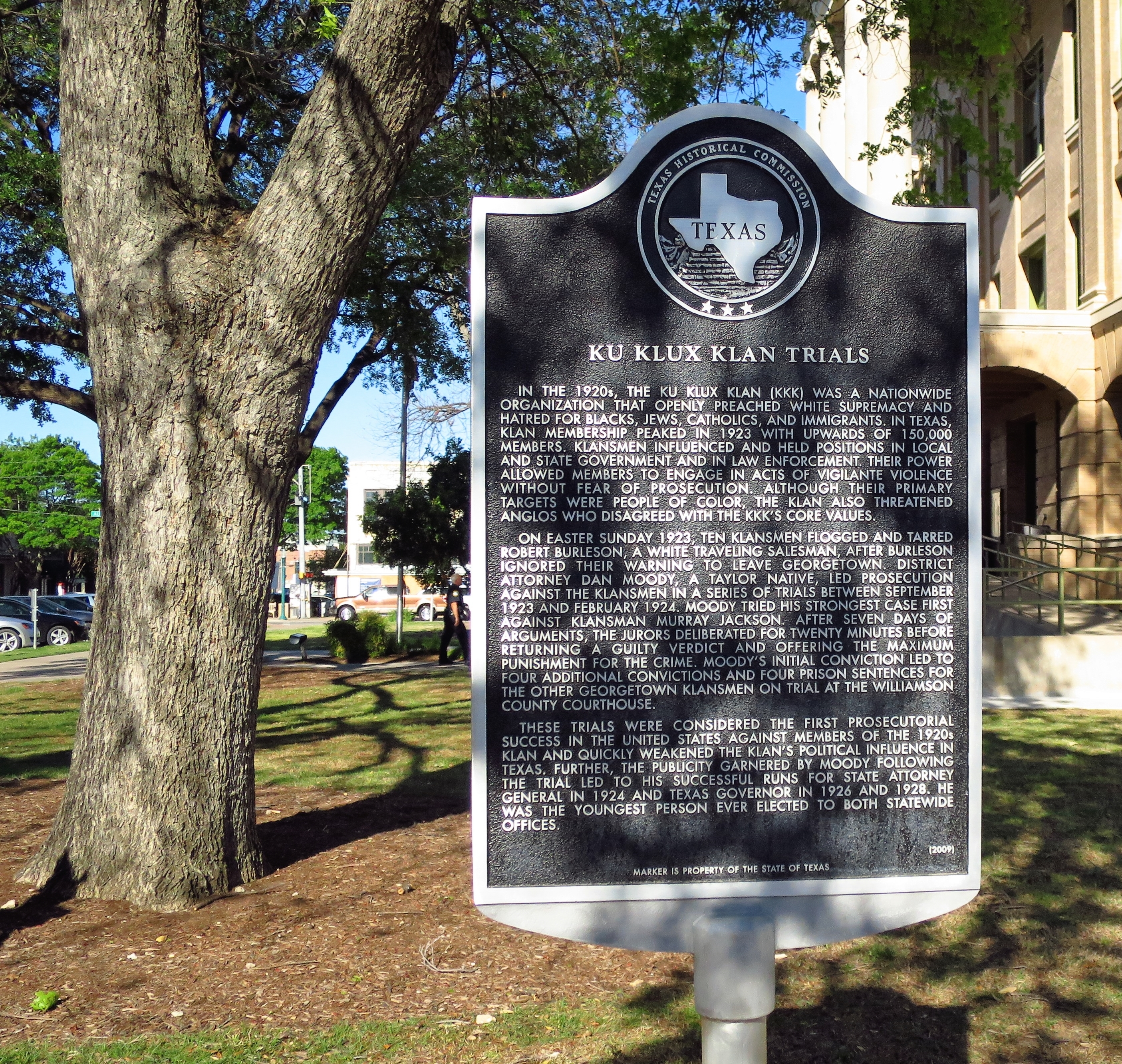 Along the side of the old courthouse stands a historical sign and a statue of county prosecutor Dan Moody (shown below). In 1923-24 Moody prosecuted ten Ku Klux Klansmen for flogging a white traveling salesman after he had ignored their warning to leave Georgetown. Despite the Klan’s impressive power in Texas at the time, Moody won his case, garnered great fame for himself, and later became state attorney general and the 30th governor of Texas.