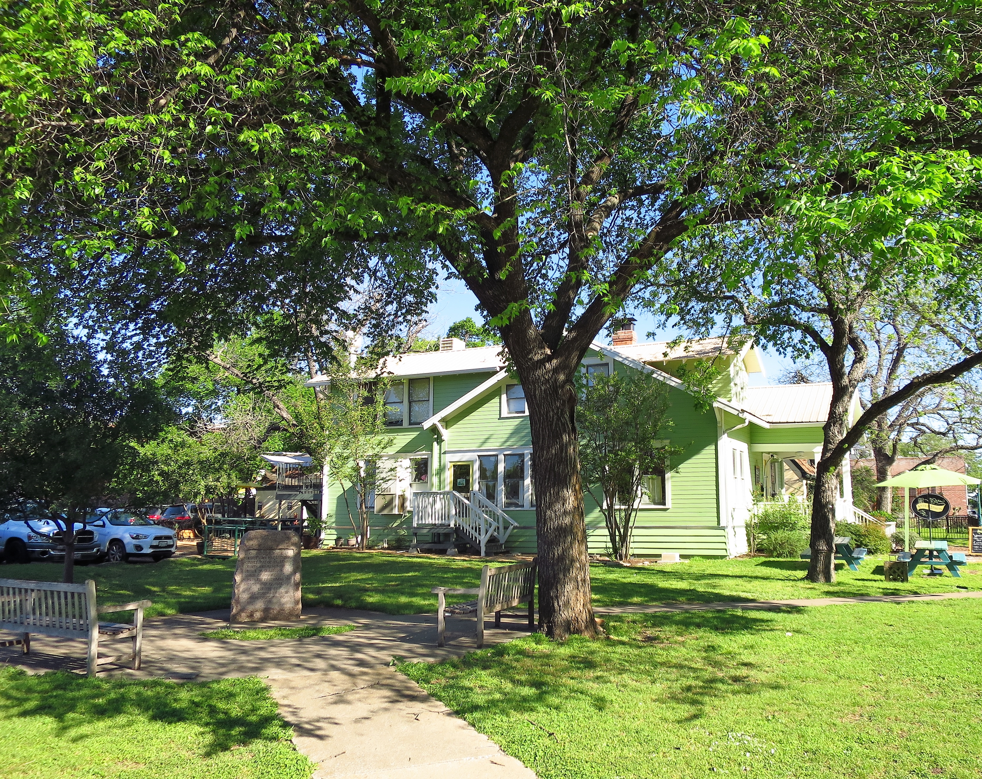 The corner park shown in the gallery below includes the town’s Founding Stone marker. The white church is nearby.